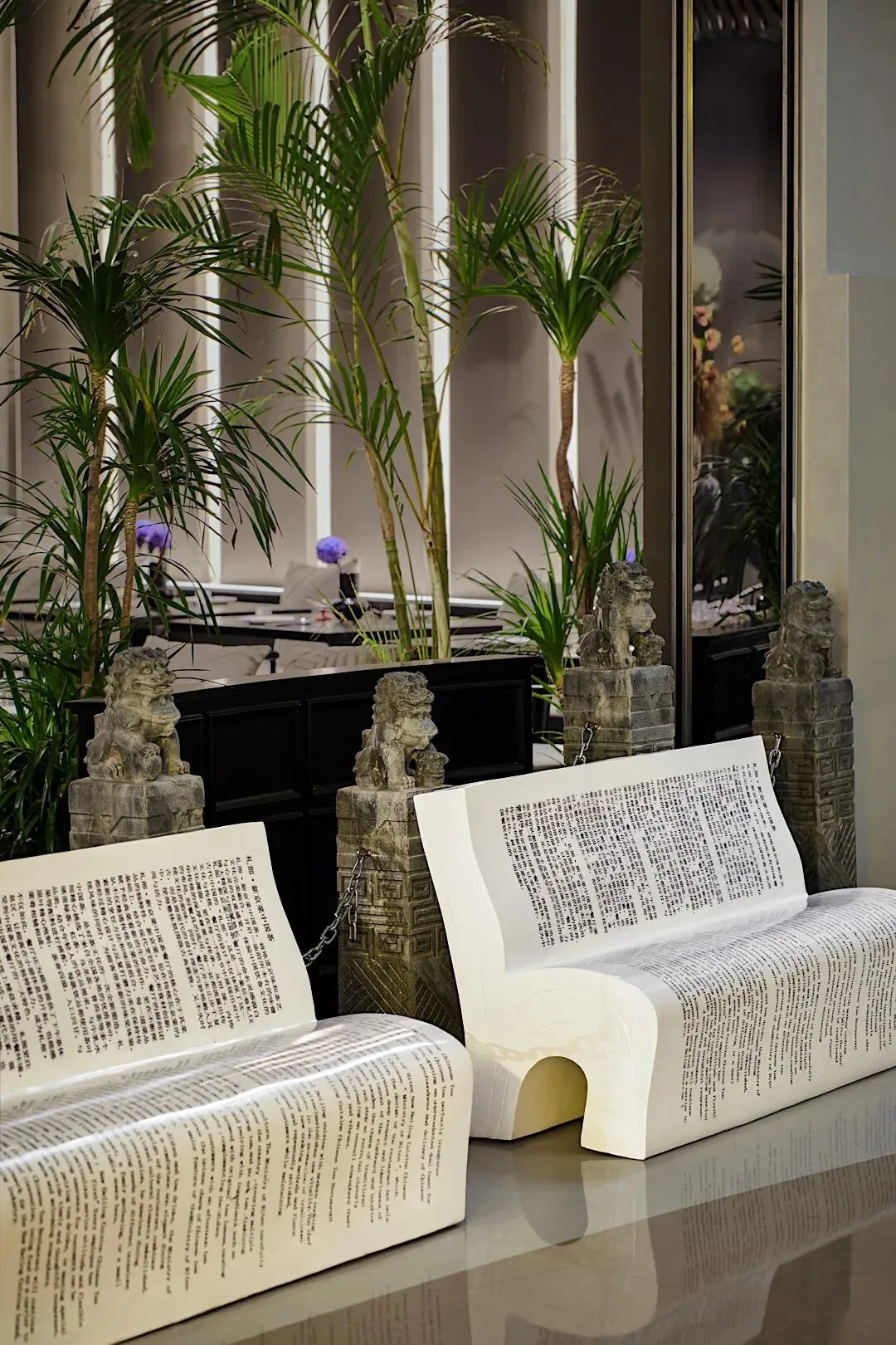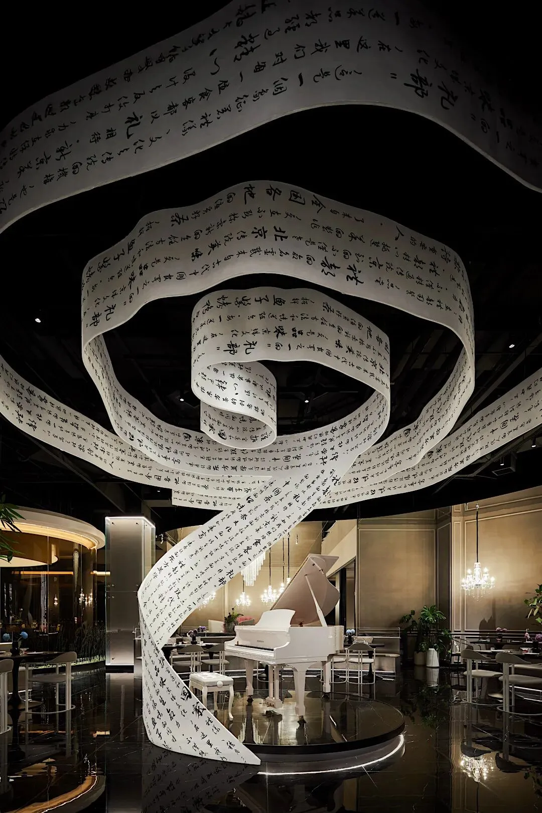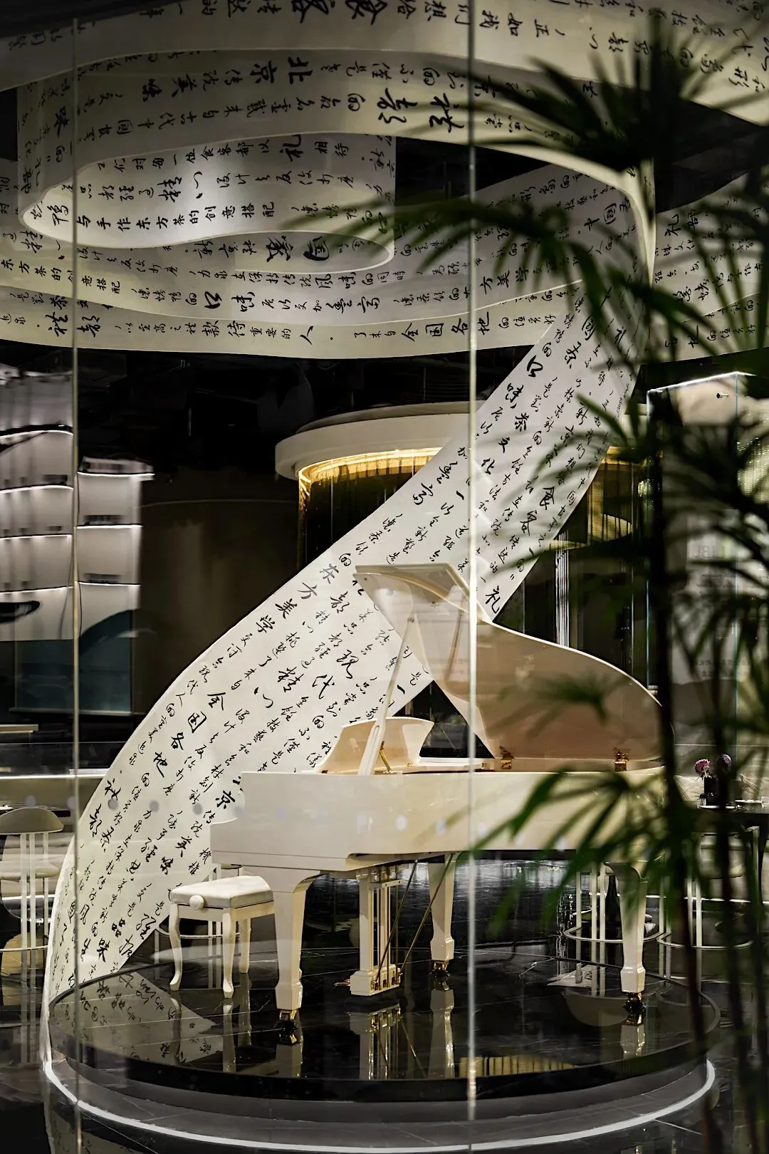 大厅中庭即为空间核心。钢琴与书法卷轴巧妙点缀,琴声与笔墨韵味交融,为社交氛围添几分雅致。这里摒弃传统院落繁复的装饰,以清代补子、仙鹤等元素为灵感,打造空间灵动造型,尽显“仙鹤踏水”之雅趣。