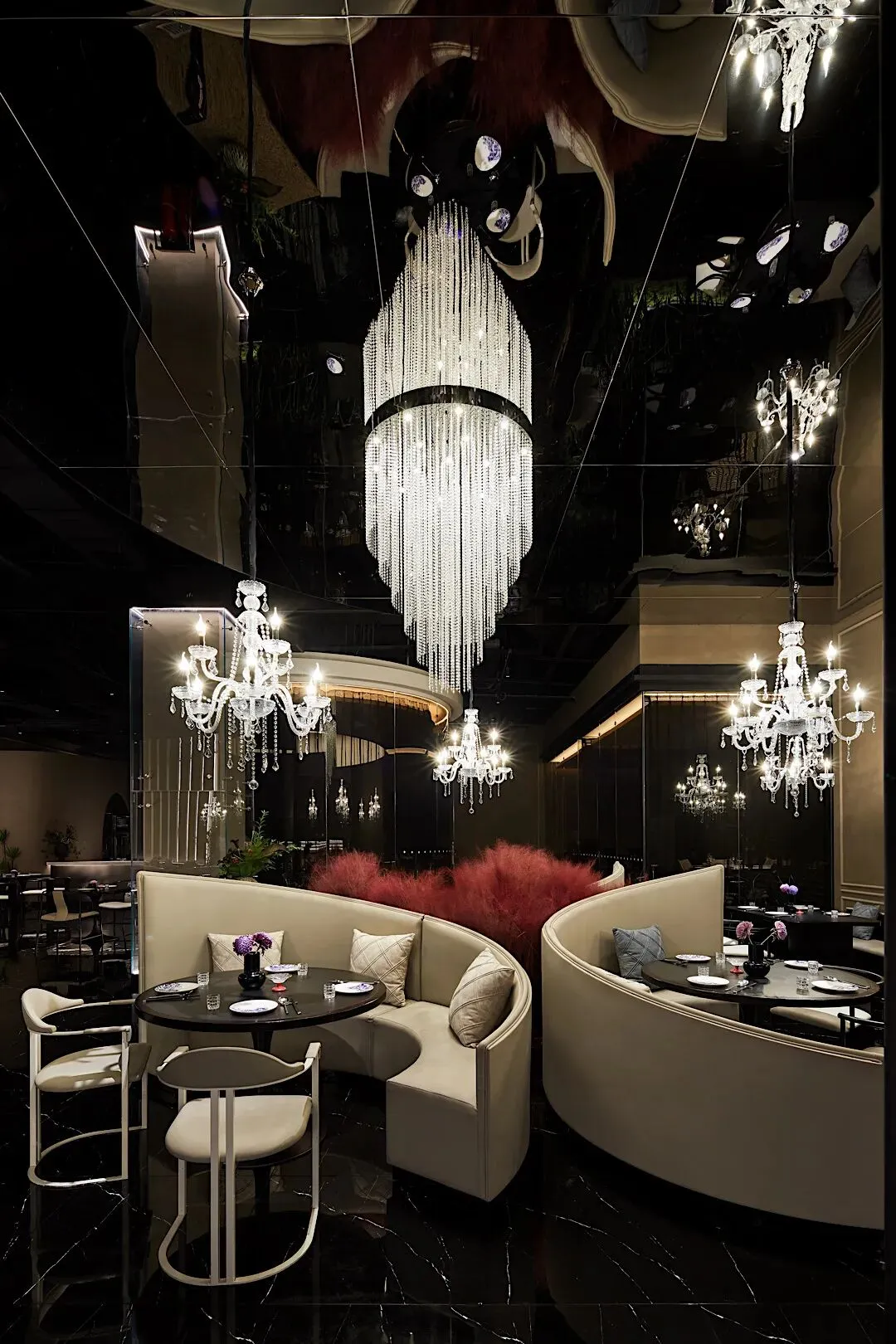 大厅以深浅撞色桌椅搭配精致灯具光影,既延续院落开阔通透感,又以现代审美营造高级氛围,适配好友欢聚畅谈;