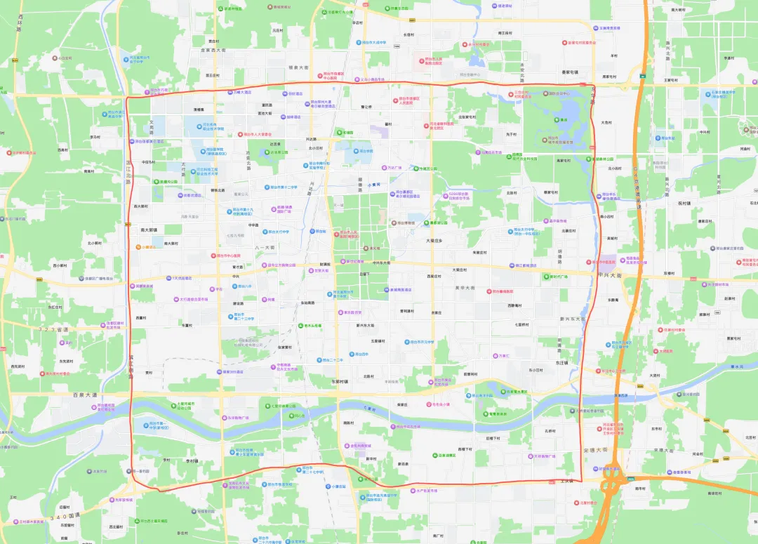 市主城区东华路、祥和大街、滨江路、龙岗大街4条道路及围合区域,含上述道路。