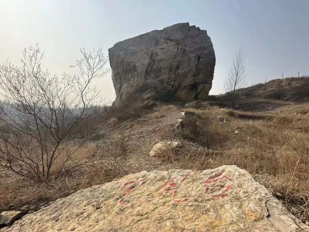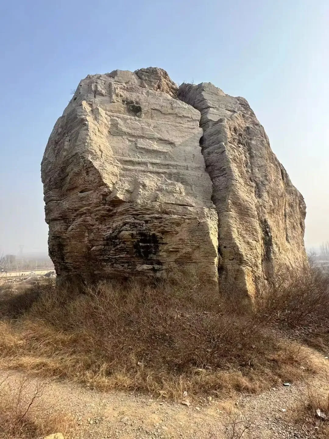 凤凰台高约十丈余,海拔32.4米。整座山体向东南方自然倾斜,形似一方天外飞来的印玺。它的顶部平坦如台,西侧却有一道巨大的裂缝纵贯山体,裂缝之上,荆棘与酸枣树顽强生长,为这坚硬的石骨增添了一抹倔强的生命色彩。