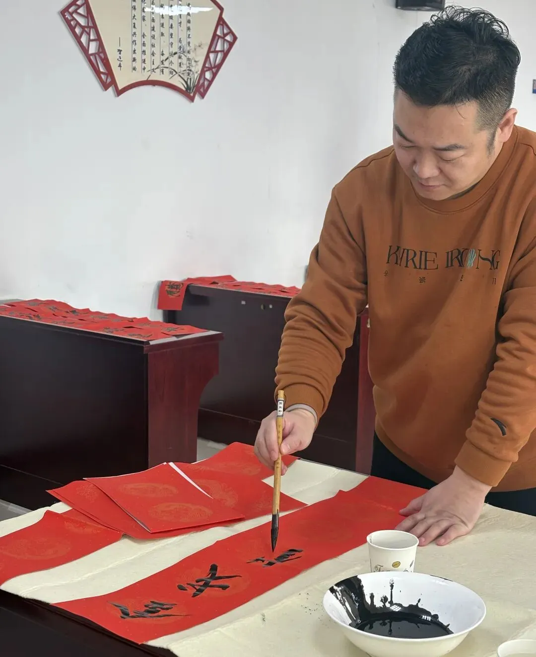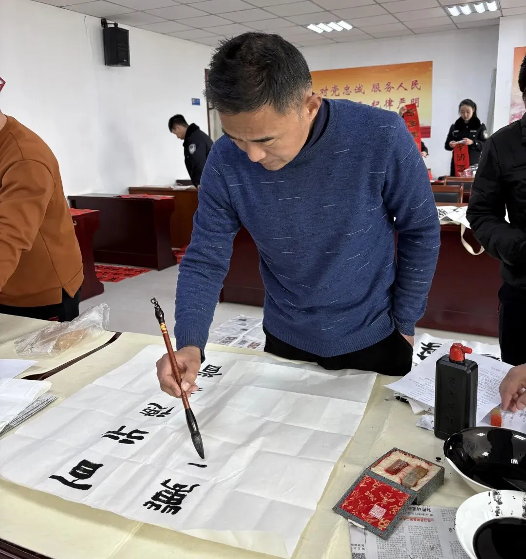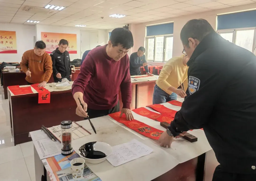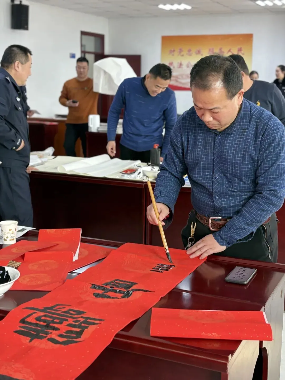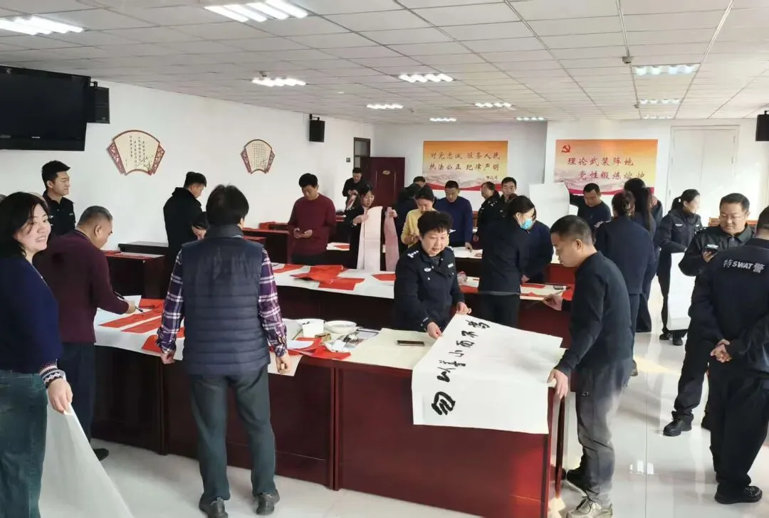 市书协副主席关建洲、杜春林、李献忠,河北公安书协副主席、市公安局一级高级警长高江涛,市公安局警察训练支队支队长张书兴,政委郑凯,警训支队副队长杨贵勇,市书协副秘书长张海洋、汲战陆,市书协理事马利征、李建涛、霍洁及市公安局警察训练支队干警代表40余人参与活动。 市公安局警察训练支队长张书兴对书法家进警营送文化表示热烈欢迎,并向书家们介绍了该局警察训练支队基本情况及取得的荣誉,肯定了书法进警营的意义,对各位书家的到来表示由衷的感谢。 副主席关建洲代表市书协李琦主席向该队各位领导和干警表示感谢,介绍了市书协连续17年在春节到来之前,长期开展的书法进万家送祝福活动情况,表示在新一届书协李琦主席的带领下,继续保持书法家进基层优良传统,并逐一介绍了参加活动的各位书家。 笔会环节气氛热烈温馨,干警们纷纷挑选心仪的春联词句,有序排队求字,书家们凝神挥毫、泼墨抒怀,围绕新春主题与干警需求,精心创作春联、福字200余幅,并根据警训大队文化建设需求创作书法作品40余件。 此次“万福迎春”公益活动走进公安警训支队不仅让干警们提前感受到了浓浓的年味,也丰富了特训支队警官们的精神文化生活,也让中国传统文化在笔墨流动中焕发出了新的生机。文稿:张海洋