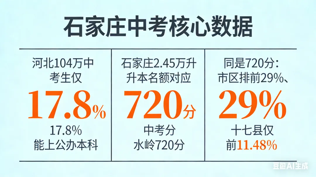 2025 年一组硬核数据在家长圈刷屏:全省 104 万中考生,对应未来公办本科总计划仅 18.5 万,无复读生情况下升本比例仅 17.8%。作为省会的石家庄,13.8 万考生中约 2.45 万能圆梦公办本科,而这一目标的分数门槛,定格在 720 分,更值得关注的是,同是 720 分,市区与十七县的位次占比相差近 18 个百分点,中考的地域差异、位次含金量,成为决定三年后高考升本的关键。这组数据不是冰冷的数字,而是给石家庄每一位中考生和家长的升学指南:中考的位次和分数,早已为三年后的高考本科路划定了起跑线,而市区与县域的升学差异,更是让这场竞争从一开始就有了不同的赛道。全省中考升本率仅 17.8%,石家庄 2.45 万本科名额成核心目标河北高考的内卷,早已从中考开始铺垫。2025 年全省中考报名人数突破 104 万,创下近年新高,而未来对应的公办本科招生计划仅 18.5 万,这意味着刨除复读生的挤占,本届应届生能考上公办本科的比例仅 17.8%。十个中考生里,最终能走进公办本科院校的,不足两人,中考的竞争,本质上就是未来公办本科的入场券之争。石家庄作为河北省会,教育资源相对优质,在全省 18.5 万公办本科名额中,占据了 2.45 万的份额,这是 13.8 万石家庄中考生共同的目标。但这份 “蛋糕” 并不好分,2.45 万的升本名额,对应到 2025 年石家庄中考一分一档线,划出了清晰的分数红线 ——720 分。这不是一个随意的数字,而是经过中考分数、位次精准匹配后的本科分水岭,达不到这个分数,未来冲击公办本科的难度将大幅提升。720 分成升本关键线,市区与十七县位次占比差近 18%同样是 720 分,在石家庄市区和十七县,却有着完全不同的位次含金量,这也是今年石家庄中考最值得关注的升学差异。数据显示,720 分在石家庄市区对应的累计排名为 11927 名,占市区考生比例的 29%;而在十七县,720 分对应的累计排名仅 11210 名,占十七县考生比例的 11.48%。近 18 个百分点的差距,道出了市区与县域中考竞争的不同格局:市区高分段考生密集,分数扎堆现象明显,同样的分数,市区考生的位次占比更高,竞争更激烈;而十七县的高分段考生相对稀缺,720 分就能跻身前 12%,位次优势显著。这也意味着,十七县的考生,若能考到 720 分,其未来冲击公办本科的基础远优于市区同分数考生;而市区考生要想稳占 2.45 万本科名额,需要比县域考生付出更多努力,在更密集的分数段中抢占更靠前的位次。位次比分数更重要,中考排名决定高考升本基础很多家长还在纠结孩子的中考分数高低,却忽略了核心关键 —— 位次。从石家庄的升本数据能清晰看出,720 分只是表象,其背后对应的市区 29%、县域 11.48% 的位次,才是未来升本的核心依据。河北高考的竞争是全省范围内的比拼,而石家庄中考的位次,直接关联着高考的全省排名。作为省会,石家庄的中考位次含金量远高于地市,中考排名越靠前,高考跻身全省公办本科计划的概率就越大。此次 2.45 万升本名额对应的 720 分位次,更是给所有考生划定了明确的目标:市区考生要力争跻身前 29%,县域考生要守住前 11.48%,这是叩响公办本科大门的基础门槛。更值得注意的是,中考的位次优势,还直接决定了高中的就读层次。石家庄的头部高中、省级示范高中,录取线基本都在 720 分以上,而这些学校的公办本科上线率,远高于普通公办高中。考上 720 分,不仅是拿到了本科的基础入场券,更是锁定了优质的高中教育资源,为三年后的高考添上了关键的砝码。中考只是起点,选科与努力才是升本决胜力当然,720 分的分水岭、17.8% 的升本率,并非意味着中考定终身。数据是基础,而三年的高中学习,才是决定最终能否升本的关键。从河北高考的招录特点来看,物理组公办本科计划远多于历史组,容错率更高,对于中考位次处于中下游的考生,优先选择物理组,是冲击公办本科的最优解。而无论是市区还是县域考生,进入高中后,都需要摆脱中考的位次束缚,持续发力:市区考生要在激烈的班级、年级竞争中保持优势,避免位次滑落;县域考生要利用好自身的位次优势,借助高中资源实现成绩提升。同时也要看到,中考的地域差异并非不可逾越。市区考生虽然竞争激烈,但能接触到更优质的师资和学习氛围;县域考生虽然位次占优,但更需要保持学习的主动性,弥补资源上的差距。只要在高中阶段找到适合的学习方法,保持稳定的发挥,即便中考位次稍逊,也能实现高考的逆袭。2025 年的中考数据,给了石家庄所有中考生和家长一个清晰的答案:公办本科的竞争,从中考就已开始,720 分的分数门槛、差异化的位次占比,是三年升学路的重要参考。但中考只是升学的起点,不是终点,17.8% 的升本率背后,是无数考生的努力与坚持。对于石家庄的孩子来说,守住 720 分的基础线,把握好位次优势,选对科目方向,再加上三年高中的不懈努力,才能在这场从中考到高考的长跑中,最终圆梦公办本科。愿每一位中考生,都能以中考为起点,在高中的赛道上全力以赴,不负韶华,不负努力。