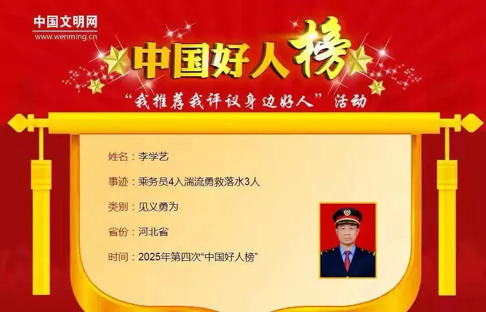 来源:中国文明网消息,2025年第四批“中国好人榜”揭晓,邯郸机务段机车乘务员李学艺,凭借滏阳河畔的生死救援壮举,光荣入选见义勇为类榜单。