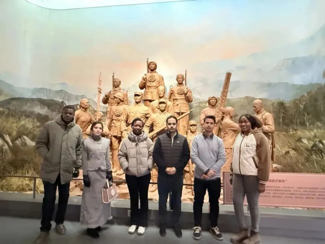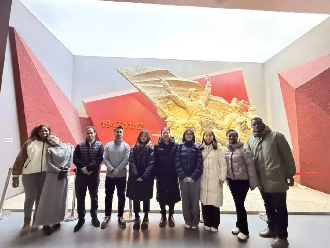 活动现场,中外师生首先步入解放纪念碑展厅。一幅幅定格历史瞬间的照片、一件件承载烽火记忆的文物、一个个还原战斗场景的展区,系统再现了石家庄解放战役的壮阔历程。外籍教师们神情专注,认真聆听讲解,不时就战役背景、历史细节提出疑问。陪同的学生们以流利英语从容应答,既展现了扎实的语言专业素养,更传递出对家国历史的深刻认同,让红色故事在跨语言解读中直抵人心。