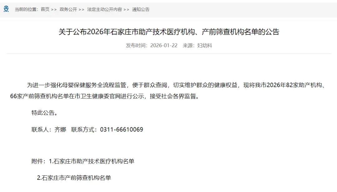 为进一步强化母婴保健服务全流程监管,便于群众查阅,切实维护群众的健康权益,石家庄市卫生健康委近日公布全市2026年助产机构、产前筛查机构名单,并在市卫生健康委官网进行公示,接受社会各界监督。