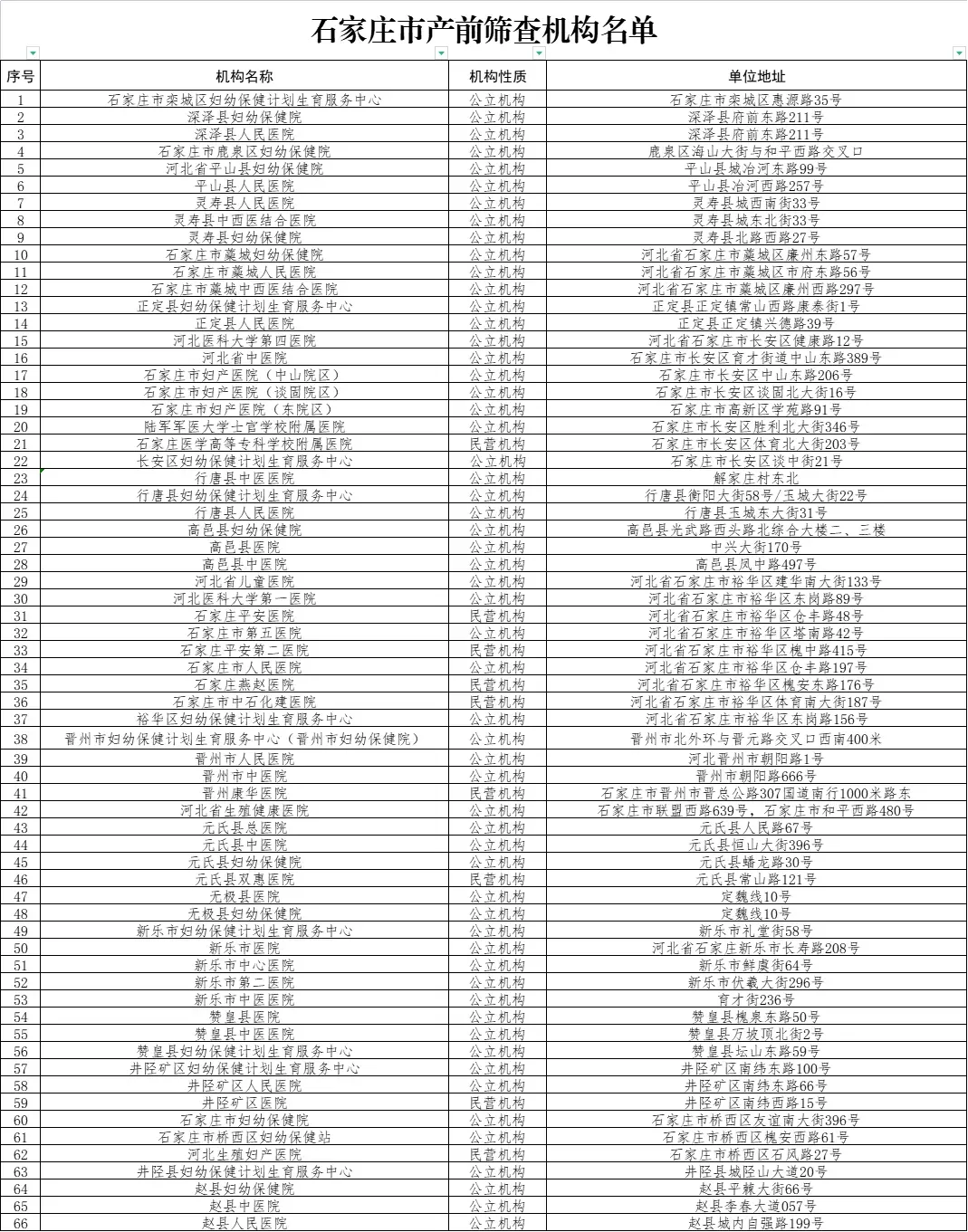 为满足广大孕妇对产前基因筛查新技术服务的需求,不断加强出生缺陷综合防治,提高出生人口素质,2026年我市继续开展孕妇无创产前基因和耳聋基因免费筛查项目。按照省委、省政府工作部署,该项目已列入2026年度省政府20项民生工程之一,这也是该项目连续第四年被列入省民生工程。根据申报程序,我市确定了石家庄市人民医院、石家庄市妇幼保健院、石家庄市妇产医院等66家医疗机构为产前筛查机构,市卫生健康委已将具体名单通过官方网站向社会公布,接受社会各界监督。