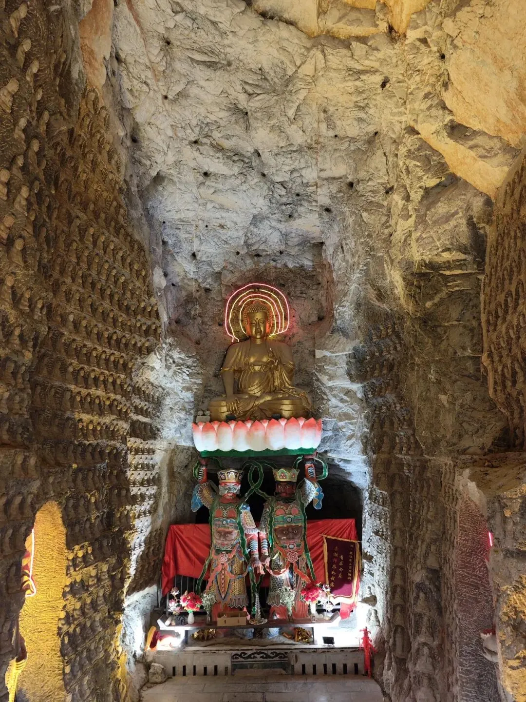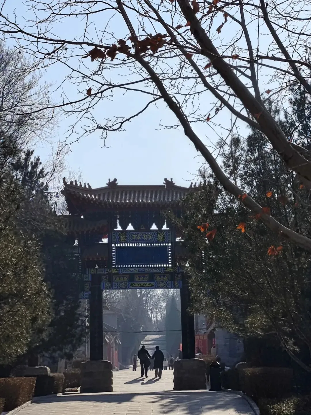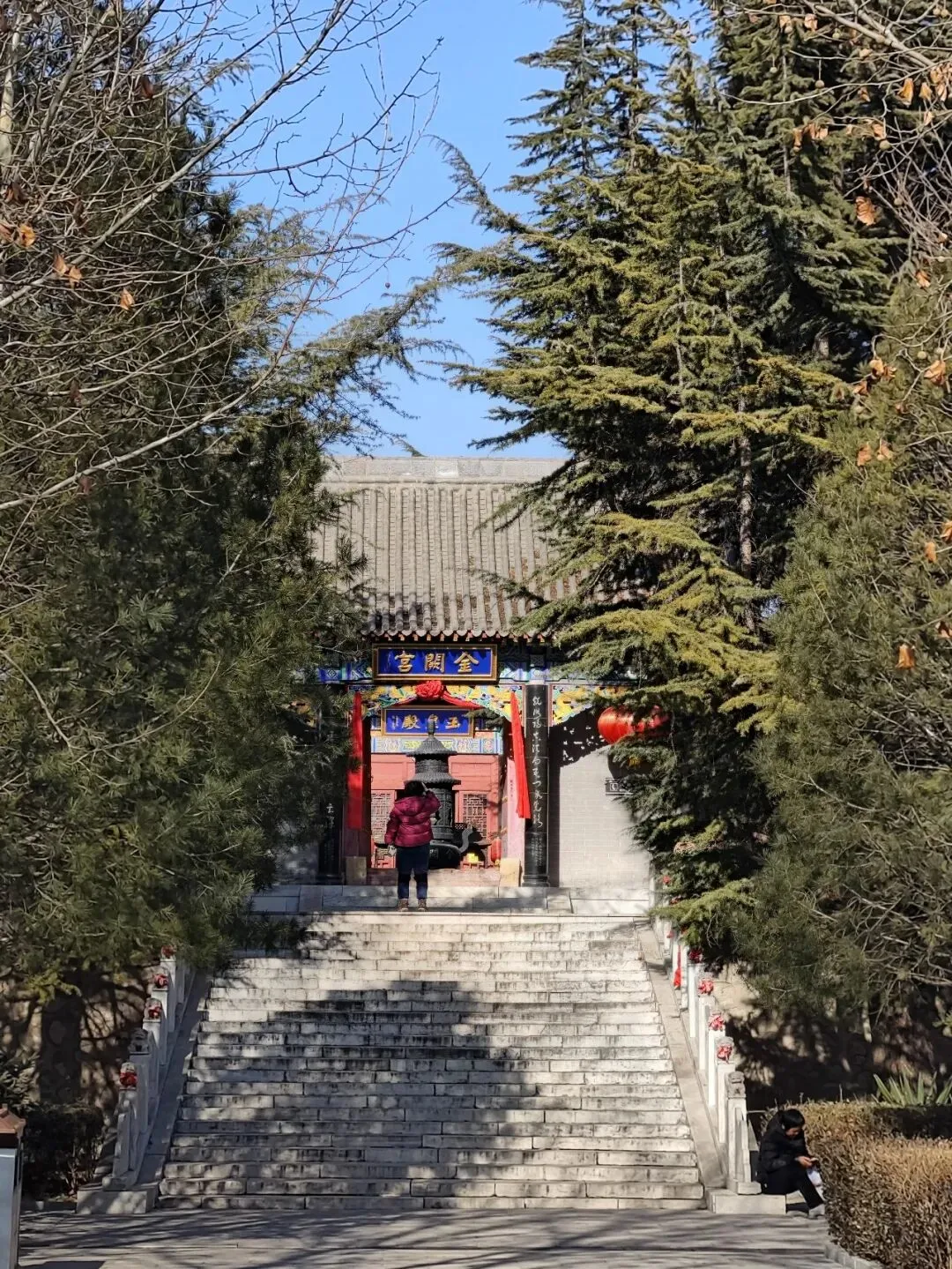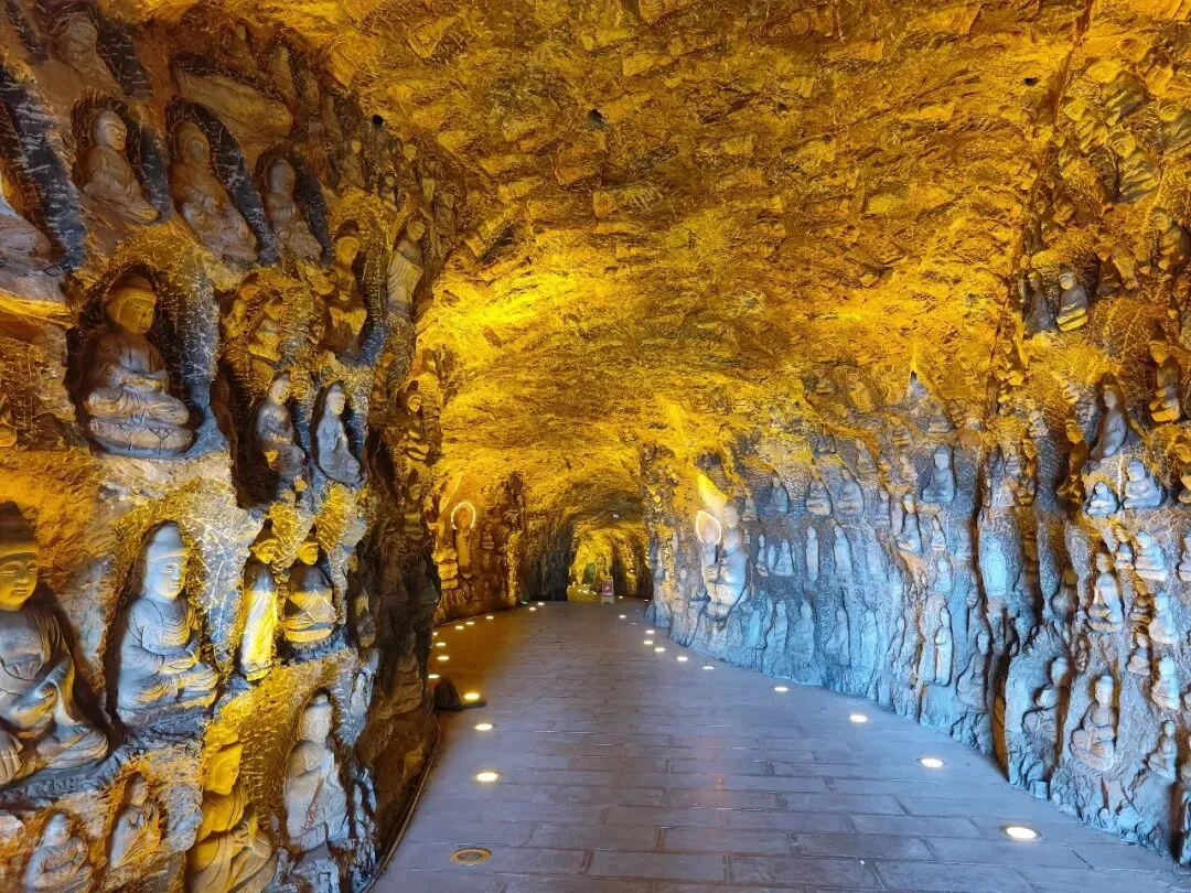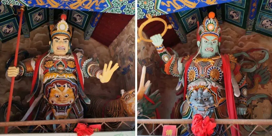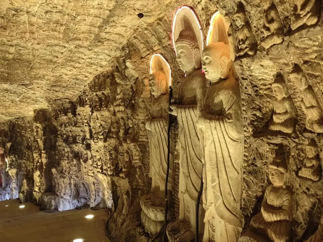 北宋时期,石家庄地区有两座比较大的城,分别是真定府、庆源府的治所,位于今正定县和赵县。抱犊寨属于真定府,差不多是距离辽国最近的地方。公元1004年,宋辽订立“澶渊之盟”,约定双方以白沟(今拒马河、海河一线)为界,正式形成了双方和平相持一百年的新局面。这些题刻大致在那个和平时期,多为河北西路官员(提点刑狱、县令、军府事等)公务之余登山避暑,祈雨赈灾,勒石留名。靖康二年(公元1127年),北宋灭亡,石家庄一带陷入金朝统治。抱犊寨后来也成了抗元的据点。仰望宋刻,想象他们来到这块平台,鲜衣轿辇,前拥互协,敬香礼佛的生动场景。一千年了,人,无论是歌咏还是战争,都不过只在山石上擦过的微小痕迹,浩瀚星宇,茫茫然。顶上的飞虹石桥,在光天化日之下,闪着明亮的光。我想,应该在春花烂漫的时候来,或者流水潺潺的夏日来,是不是更不一样。从万佛洞出来,位于寨顶北部,是景区打造的另一处景观——牛郎织女家。这是一个仿古四合院建筑。门前为天池,后依长城,青堂瓦舍,绿树环合。走进这个四合院,院内有水井,屋内有牛车,卧着一头铜牛。院东有牛郎的谷场、碾子、磨盘,院西为菜园。正房、厢房内有蜡像牛郎织女故事场景,其中正房中间为牛女成亲场面。我想七夕之日,到这里来应景的年轻人一定很多。天池水已经封冻了,池上有一座玉带小桥,池畔有石林造型及供小憩的长廊。这块光彩夺目的琉璃壁,高13米,长38米,有九百九十九条大小各异的琉璃龙浮跃于上,称之为抱犊寨一大奇观。壁的后面有“抱犊福地”四个大字。照壁前方是五百罗汉堂,是全国最大的山顶地下石雕群。罗汉堂由地上和地下两层构成,地上是“弥勒殿”,地下是“五百罗汉堂”。走入地下,要穿过汉白玉的甬道,中间镌刻有十三条浮雕腾龙。这条甬道很长,地宫的阴深感压过来。我想,为什么要把罗汉堂建在地下呢。罗汉的石材全部使用当地鹿泉青石,由曲阳雕刻大师精雕细琢而成。不得不说,河北曲阳的工艺全国一流。我转在罗汉们的身前身后,这些绚烂多彩的罗汉真可爱,刚才的阴冷之意被化解开了,继而被他们的形态所感染,也喜笑颜开。我还是再想,为什么要把罗汉堂建在地下呢,让他们在地上殿堂是不是更好。与罗汉们依依不舍的告别。一院红墙外列着苍柏仪仗队。这是山顶道观——金阕宫。三个字里有“阙宫”两字,我发现几乎所有人,至少跟我擦肩而过进门的人,都听见他们嘴里不由自主地念叨出“天上宫阙”,继而要延伸出“今夕是何年”。金阙宫创自金元时代,明清鼎盛,自古以来就是道家福地,北岳之佐命。“北岳之佐命”是道教神话中辅佐北岳恒山君(北岳大帝)的两座从祀名山。五岳各有佐命,北岳恒山的佐命山,古籍载为河逢山、抱犊山。佐命山如同北岳的“辅相”,协同主掌北方水系安宁、走兽昆虫等神职,强化“北岳”镇北护边“的神格体系。”噢,原来如此。走进这座外表看着就金碧辉煌,神秘而悠久的道观。山门内,手持法器的不是哼哈二将,是道教护法神“青龙孟章神君”和“白虎监兵神君”。阳光洒在金色的屋顶和院内,松柏苍翠,福带飘飘。寺观复建于上世纪九十年代,距今也有三十年了。宫内以玉皇殿为中心,两侧配祀三清殿和三官殿。三清殿供奉三清祖师玉清、上清和太清;天宫殿内供奉天官、地官和水官。道教神祇与佛教不同,但跟老百姓的祈福的生活是密切相关。金阙宫没有供奉抱犊山真君,主殿玉皇殿奉玉皇大帝。玉皇大帝,全称“昊天金阙至尊玉皇大帝”,与宫名“金阙”呼应。殿内玉皇大帝着帝王穿戴,他前面一尊为真武大帝。玉皇大帝总管三界、十方、四生、六道的一切阴阳祸福,在汉族民间信仰中是众神之最,是天界最高主宰之神,是天上第一。环顾四周,两壁有壁画,鼓、锣、磬一应必备。殿内繁复而非杂乱,像刚完成一场热烈的表演,而恰好道士不在。金阙宫有“镇宫三宝”:壁画、“碧桃有灵”古桃树和抱犊寨道乐。玉皇殿两壁的壁画,为1991年复建金阙宫时绘制,画面上玉皇大帝升座,两侧环列天兵天将、星宿神祇、南极仙翁、八仙等,彰显天庭威仪。