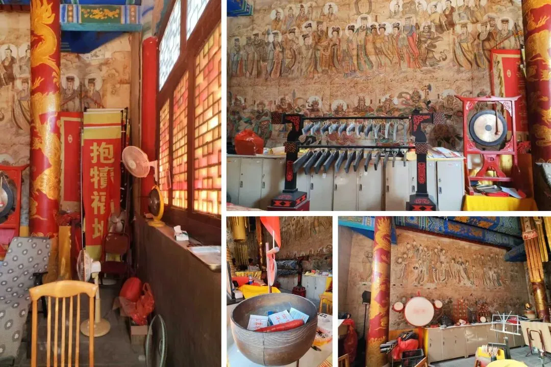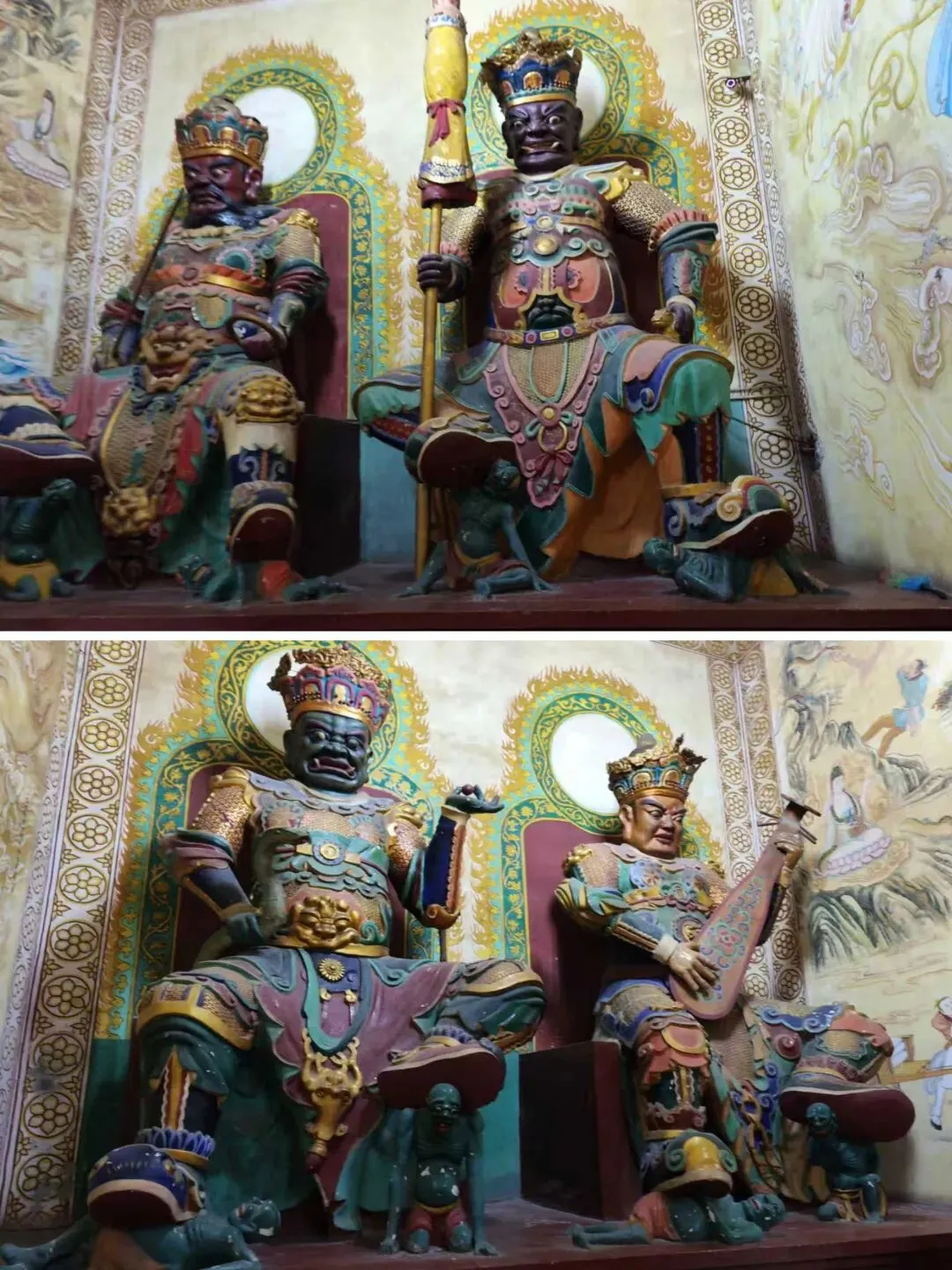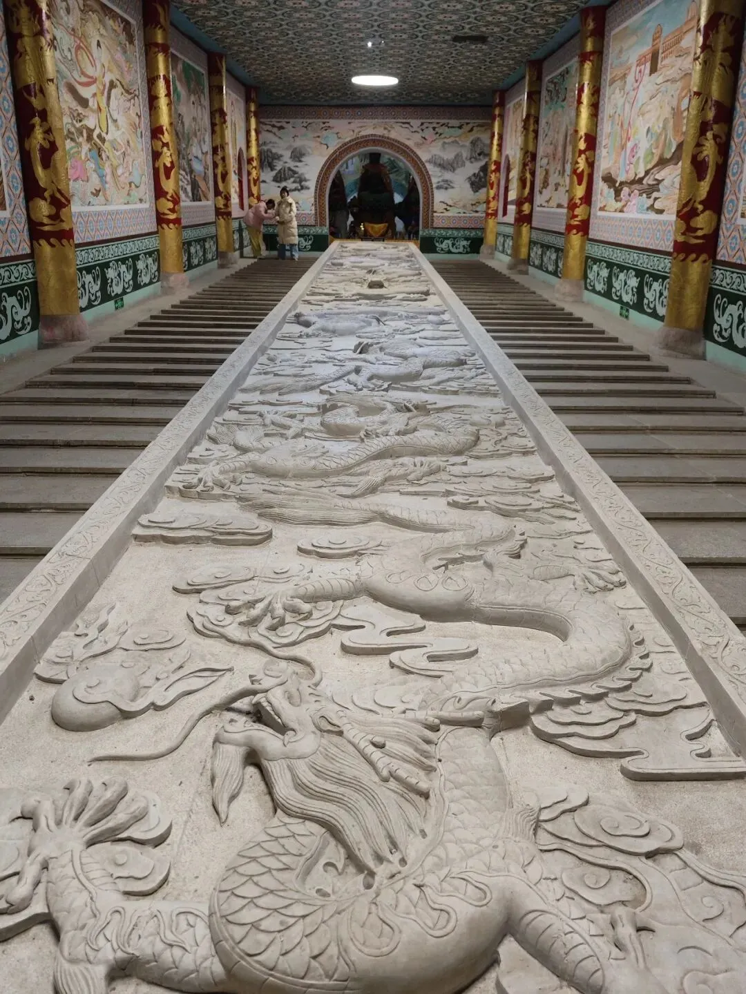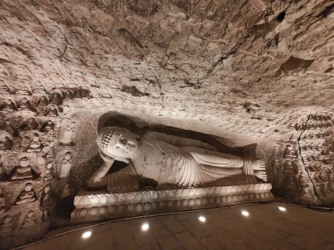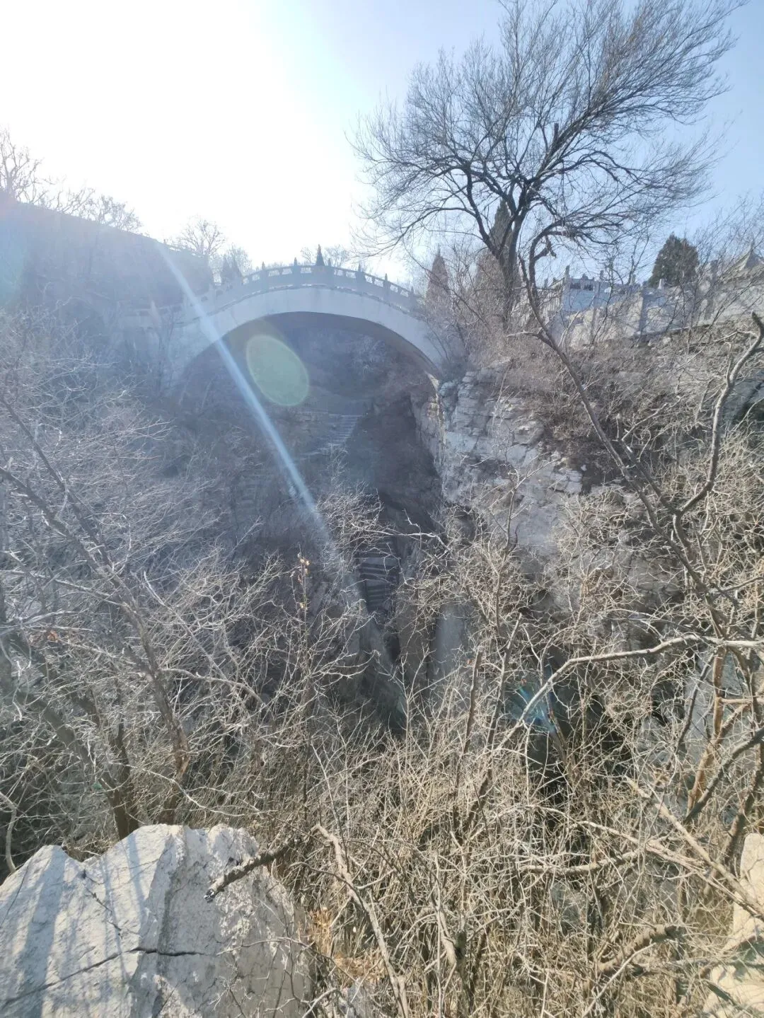 北宋时期,石家庄地区有两座比较大的城,分别是真定府、庆源府的治所,位于今正定县和赵县。抱犊寨属于真定府,差不多是距离辽国最近的地方。公元1004年,宋辽订立“澶渊之盟”,约定双方以白沟(今拒马河、海河一线)为界,正式形成了双方和平相持一百年的新局面。这些题刻大致在那个和平时期,多为河北西路官员(提点刑狱、县令、军府事等)公务之余登山避暑,祈雨赈灾,勒石留名。靖康二年(公元1127年),北宋灭亡,石家庄一带陷入金朝统治。抱犊寨后来也成了抗元的据点。仰望宋刻,想象他们来到这块平台,鲜衣轿辇,前拥互协,敬香礼佛的生动场景。一千年了,人,无论是歌咏还是战争,都不过只在山石上擦过的微小痕迹,浩瀚星宇,茫茫然。顶上的飞虹石桥,在光天化日之下,闪着明亮的光。我想,应该在春花烂漫的时候来,或者流水潺潺的夏日来,是不是更不一样。从万佛洞出来,位于寨顶北部,是景区打造的另一处景观——牛郎织女家。这是一个仿古四合院建筑。门前为天池,后依长城,青堂瓦舍,绿树环合。走进这个四合院,院内有水井,屋内有牛车,卧着一头铜牛。院东有牛郎的谷场、碾子、磨盘,院西为菜园。正房、厢房内有蜡像牛郎织女故事场景,其中正房中间为牛女成亲场面。我想七夕之日,到这里来应景的年轻人一定很多。天池水已经封冻了,池上有一座玉带小桥,池畔有石林造型及供小憩的长廊。这块光彩夺目的琉璃壁,高13米,长38米,有九百九十九条大小各异的琉璃龙浮跃于上,称之为抱犊寨一大奇观。壁的后面有“抱犊福地”四个大字。照壁前方是五百罗汉堂,是全国最大的山顶地下石雕群。罗汉堂由地上和地下两层构成,地上是“弥勒殿”,地下是“五百罗汉堂”。走入地下,要穿过汉白玉的甬道,中间镌刻有十三条浮雕腾龙。这条甬道很长,地宫的阴深感压过来。我想,为什么要把罗汉堂建在地下呢。罗汉的石材全部使用当地鹿泉青石,由曲阳雕刻大师精雕细琢而成。不得不说,河北曲阳的工艺全国一流。我转在罗汉们的身前身后,这些绚烂多彩的罗汉真可爱,刚才的阴冷之意被化解开了,继而被他们的形态所感染,也喜笑颜开。我还是再想,为什么要把罗汉堂建在地下呢,让他们在地上殿堂是不是更好。与罗汉们依依不舍的告别。一院红墙外列着苍柏仪仗队。这是山顶道观——金阕宫。三个字里有“阙宫”两字,我发现几乎所有人,至少跟我擦肩而过进门的人,都听见他们嘴里不由自主地念叨出“天上宫阙”,继而要延伸出“今夕是何年”。金阙宫创自金元时代,明清鼎盛,自古以来就是道家福地,北岳之佐命。“北岳之佐命”是道教神话中辅佐北岳恒山君(北岳大帝)的两座从祀名山。五岳各有佐命,北岳恒山的佐命山,古籍载为河逢山、抱犊山。佐命山如同北岳的“辅相”,协同主掌北方水系安宁、走兽昆虫等神职,强化“北岳”镇北护边“的神格体系。”噢,原来如此。走进这座外表看着就金碧辉煌,神秘而悠久的道观。山门内,手持法器的不是哼哈二将,是道教护法神“青龙孟章神君”和“白虎监兵神君”。阳光洒在金色的屋顶和院内,松柏苍翠,福带飘飘。寺观复建于上世纪九十年代,距今也有三十年了。宫内以玉皇殿为中心,两侧配祀三清殿和三官殿。三清殿供奉三清祖师玉清、上清和太清;天宫殿内供奉天官、地官和水官。道教神祇与佛教不同,但跟老百姓的祈福的生活是密切相关。金阙宫没有供奉抱犊山真君,主殿玉皇殿奉玉皇大帝。玉皇大帝,全称“昊天金阙至尊玉皇大帝”,与宫名“金阙”呼应。殿内玉皇大帝着帝王穿戴,他前面一尊为真武大帝。玉皇大帝总管三界、十方、四生、六道的一切阴阳祸福,在汉族民间信仰中是众神之最,是天界最高主宰之神,是天上第一。环顾四周,两壁有壁画,鼓、锣、磬一应必备。殿内繁复而非杂乱,像刚完成一场热烈的表演,而恰好道士不在。金阙宫有“镇宫三宝”:壁画、“碧桃有灵”古桃树和抱犊寨道乐。玉皇殿两壁的壁画,为1991年复建金阙宫时绘制,画面上玉皇大帝升座,两侧环列天兵天将、星宿神祇、南极仙翁、八仙等,彰显天庭威仪。