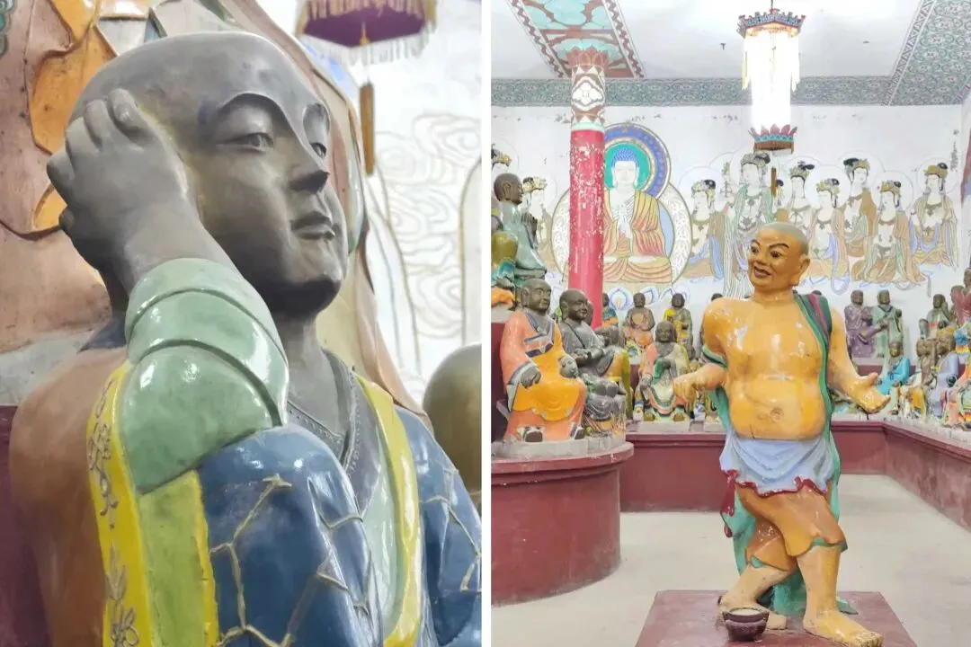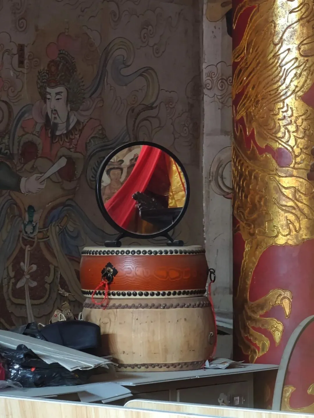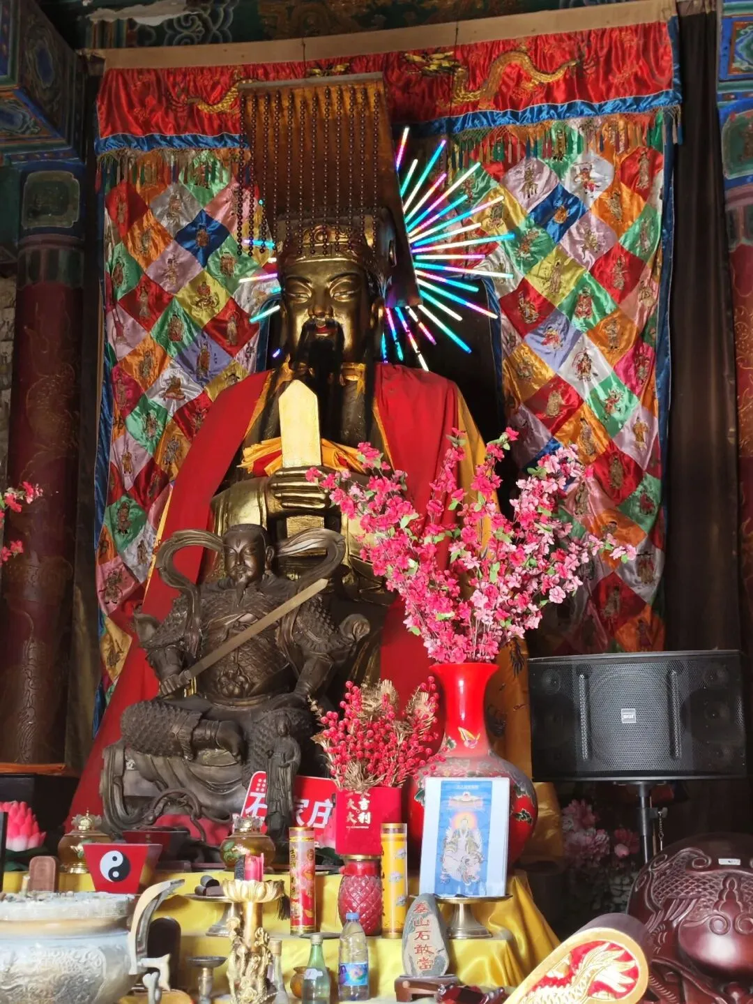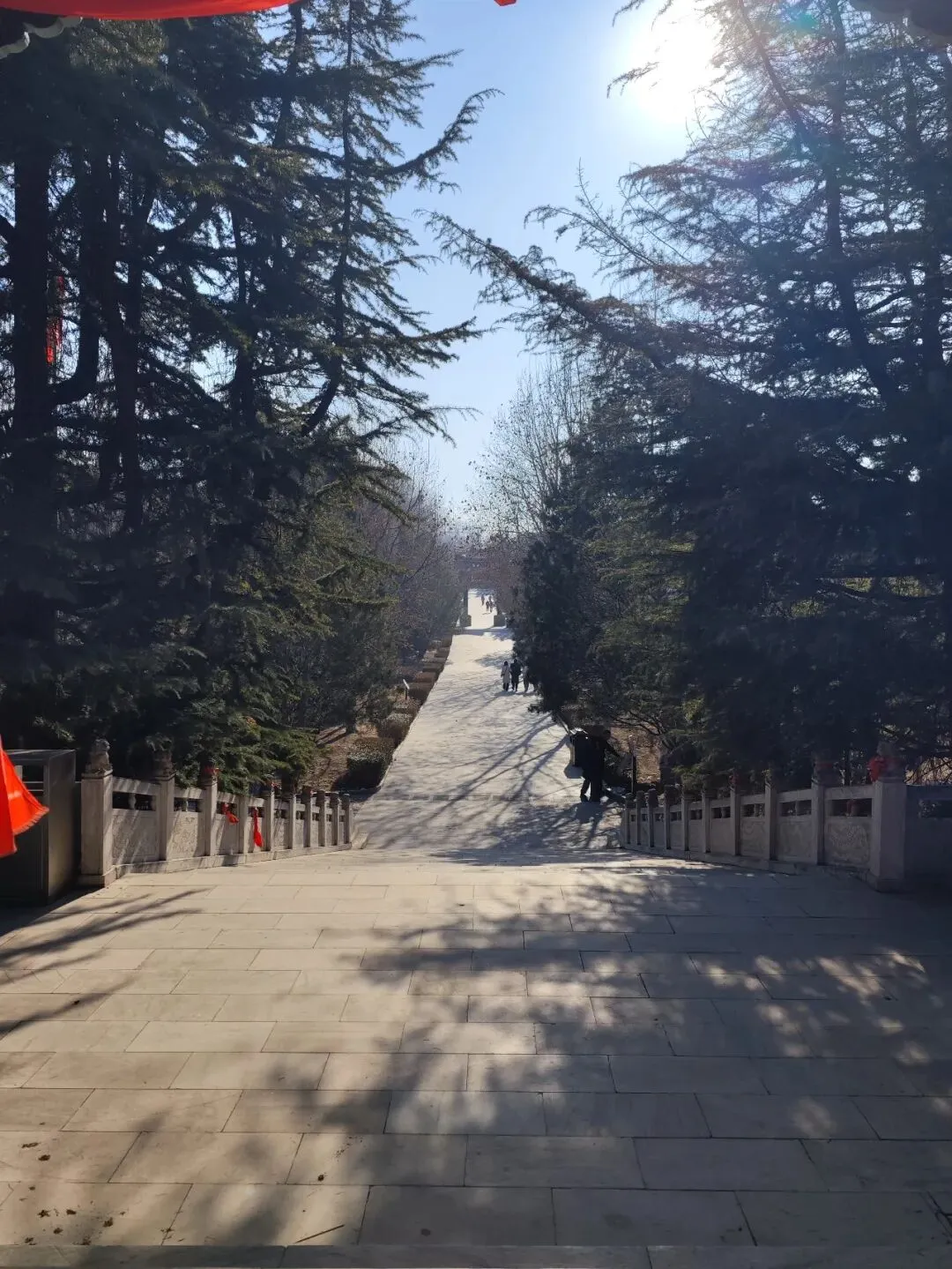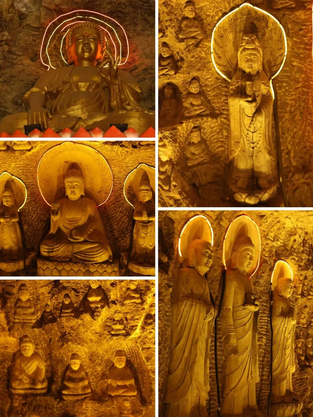 北宋时期,石家庄地区有两座比较大的城,分别是真定府、庆源府的治所,位于今正定县和赵县。抱犊寨属于真定府,差不多是距离辽国最近的地方。公元1004年,宋辽订立“澶渊之盟”,约定双方以白沟(今拒马河、海河一线)为界,正式形成了双方和平相持一百年的新局面。这些题刻大致在那个和平时期,多为河北西路官员(提点刑狱、县令、军府事等)公务之余登山避暑,祈雨赈灾,勒石留名。靖康二年(公元1127年),北宋灭亡,石家庄一带陷入金朝统治。抱犊寨后来也成了抗元的据点。仰望宋刻,想象他们来到这块平台,鲜衣轿辇,前拥互协,敬香礼佛的生动场景。一千年了,人,无论是歌咏还是战争,都不过只在山石上擦过的微小痕迹,浩瀚星宇,茫茫然。顶上的飞虹石桥,在光天化日之下,闪着明亮的光。我想,应该在春花烂漫的时候来,或者流水潺潺的夏日来,是不是更不一样。从万佛洞出来,位于寨顶北部,是景区打造的另一处景观——牛郎织女家。这是一个仿古四合院建筑。门前为天池,后依长城,青堂瓦舍,绿树环合。走进这个四合院,院内有水井,屋内有牛车,卧着一头铜牛。院东有牛郎的谷场、碾子、磨盘,院西为菜园。正房、厢房内有蜡像牛郎织女故事场景,其中正房中间为牛女成亲场面。我想七夕之日,到这里来应景的年轻人一定很多。天池水已经封冻了,池上有一座玉带小桥,池畔有石林造型及供小憩的长廊。这块光彩夺目的琉璃壁,高13米,长38米,有九百九十九条大小各异的琉璃龙浮跃于上,称之为抱犊寨一大奇观。壁的后面有“抱犊福地”四个大字。照壁前方是五百罗汉堂,是全国最大的山顶地下石雕群。罗汉堂由地上和地下两层构成,地上是“弥勒殿”,地下是“五百罗汉堂”。走入地下,要穿过汉白玉的甬道,中间镌刻有十三条浮雕腾龙。这条甬道很长,地宫的阴深感压过来。我想,为什么要把罗汉堂建在地下呢。罗汉的石材全部使用当地鹿泉青石,由曲阳雕刻大师精雕细琢而成。不得不说,河北曲阳的工艺全国一流。我转在罗汉们的身前身后,这些绚烂多彩的罗汉真可爱,刚才的阴冷之意被化解开了,继而被他们的形态所感染,也喜笑颜开。我还是再想,为什么要把罗汉堂建在地下呢,让他们在地上殿堂是不是更好。与罗汉们依依不舍的告别。一院红墙外列着苍柏仪仗队。这是山顶道观——金阕宫。三个字里有“阙宫”两字,我发现几乎所有人,至少跟我擦肩而过进门的人,都听见他们嘴里不由自主地念叨出“天上宫阙”,继而要延伸出“今夕是何年”。金阙宫创自金元时代,明清鼎盛,自古以来就是道家福地,北岳之佐命。“北岳之佐命”是道教神话中辅佐北岳恒山君(北岳大帝)的两座从祀名山。五岳各有佐命,北岳恒山的佐命山,古籍载为河逢山、抱犊山。佐命山如同北岳的“辅相”,协同主掌北方水系安宁、走兽昆虫等神职,强化“北岳”镇北护边“的神格体系。”噢,原来如此。走进这座外表看着就金碧辉煌,神秘而悠久的道观。山门内,手持法器的不是哼哈二将,是道教护法神“青龙孟章神君”和“白虎监兵神君”。阳光洒在金色的屋顶和院内,松柏苍翠,福带飘飘。寺观复建于上世纪九十年代,距今也有三十年了。宫内以玉皇殿为中心,两侧配祀三清殿和三官殿。三清殿供奉三清祖师玉清、上清和太清;天宫殿内供奉天官、地官和水官。道教神祇与佛教不同,但跟老百姓的祈福的生活是密切相关。金阙宫没有供奉抱犊山真君,主殿玉皇殿奉玉皇大帝。玉皇大帝,全称“昊天金阙至尊玉皇大帝”,与宫名“金阙”呼应。殿内玉皇大帝着帝王穿戴,他前面一尊为真武大帝。玉皇大帝总管三界、十方、四生、六道的一切阴阳祸福,在汉族民间信仰中是众神之最,是天界最高主宰之神,是天上第一。环顾四周,两壁有壁画,鼓、锣、磬一应必备。殿内繁复而非杂乱,像刚完成一场热烈的表演,而恰好道士不在。金阙宫有“镇宫三宝”:壁画、“碧桃有灵”古桃树和抱犊寨道乐。玉皇殿两壁的壁画,为1991年复建金阙宫时绘制,画面上玉皇大帝升座,两侧环列天兵天将、星宿神祇、南极仙翁、八仙等,彰显天庭威仪。