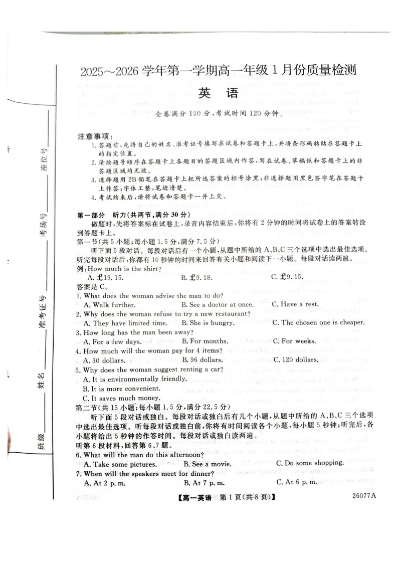 河北省石家庄市七县联合体2025-2026学年高一上学期1月月考