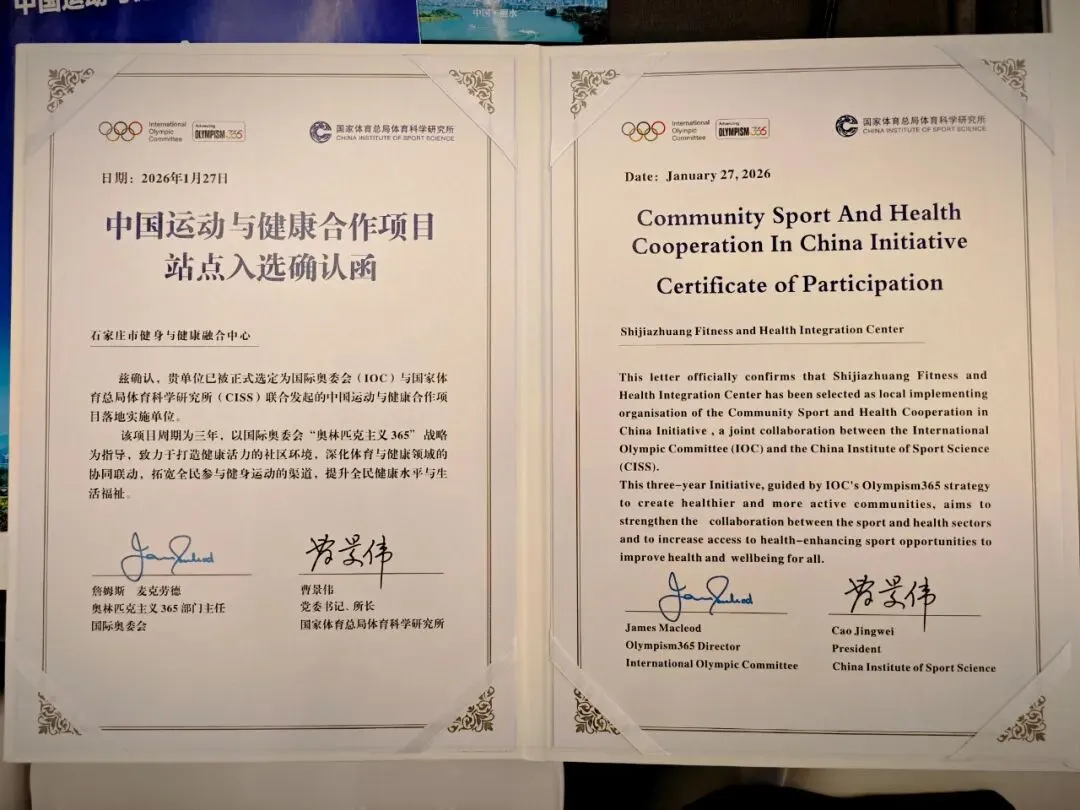 1月27日,在浙江省丽水市举行的中国运动与健康合作项目启动会上,石家庄市健身与健康融合中心被正式选定为国际奥委会(IOC)与国家体育总局体育科学研究所(CISS)联合发起的中国运动与健康合作项目落地实施单位。