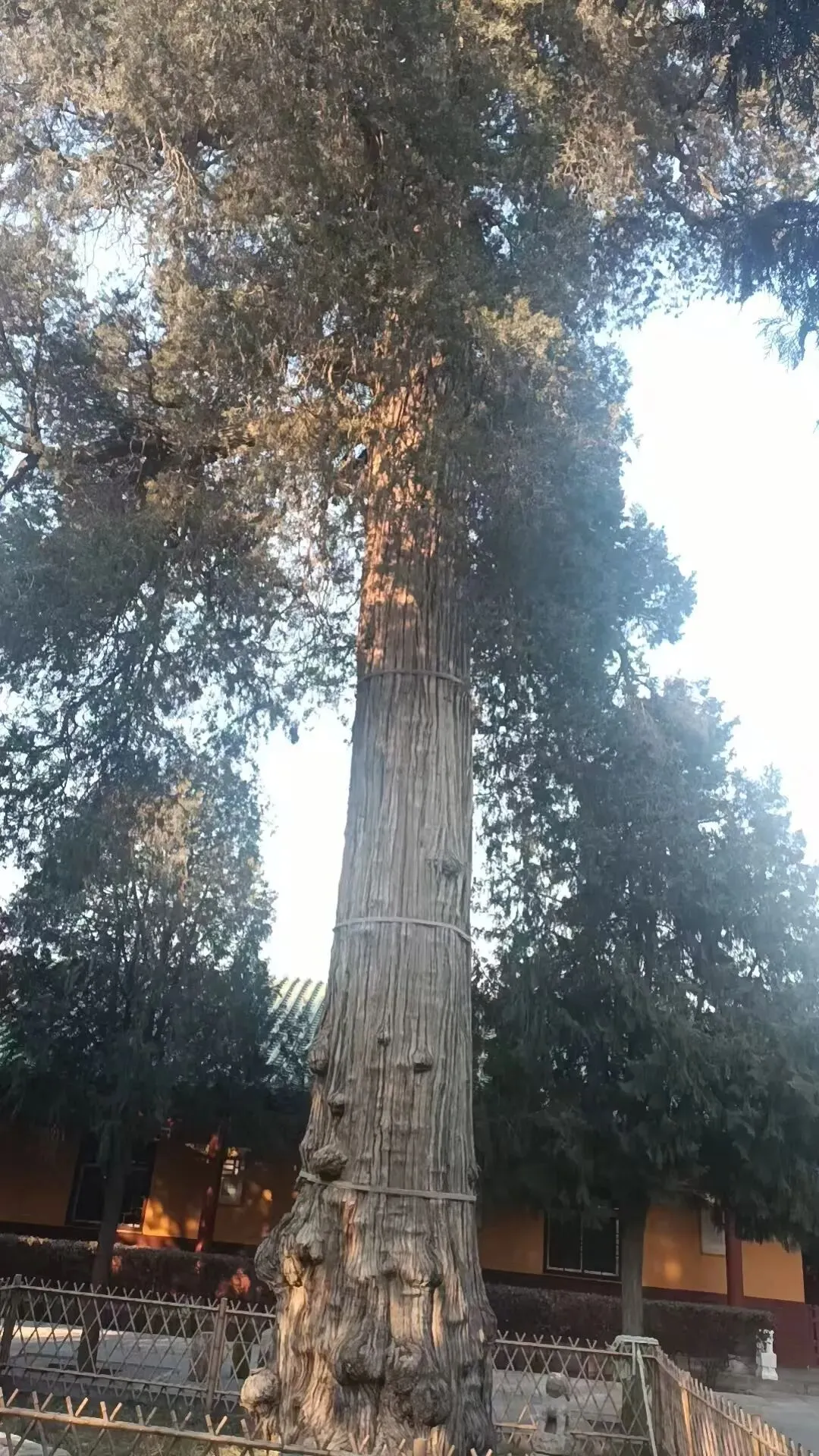 我们在三株唐柏前驻足留恋了很久。这三棵柏树都有1200多年的历史。尤其是鸟柏,树干遒劲,树冠葱葱,如烟如云。据说常栖息珍禽,迎风自吟。树干自中部以下,由窄到宽赫然一条伤痕,柏纹如落鸟,落鸟如柏纹。据说是一南方匠人为偷走鸟柏所劈。我仰视鸟柏,想着它以伤残之躯,支撑如盖翠云,在千年中历尽风雨,该是何等的坚韧。又到茶柏前,很想折几枝树叶制茶尝鲜,但是也不过是转瞬一念。