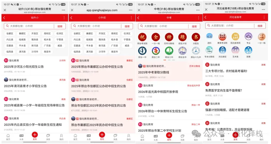 现有2025年小升初12个校园微信群,覆盖4000人,2026年新初三中考群13个;覆盖5000人,累计往年中考生到高考生本地家长约20000人!根据抖音官方回复,"强化教育"话题邢台本地播放3700万以上。累计播放邢台本地教育政策信息超2亿!为本地升学实用性最强的教育平台