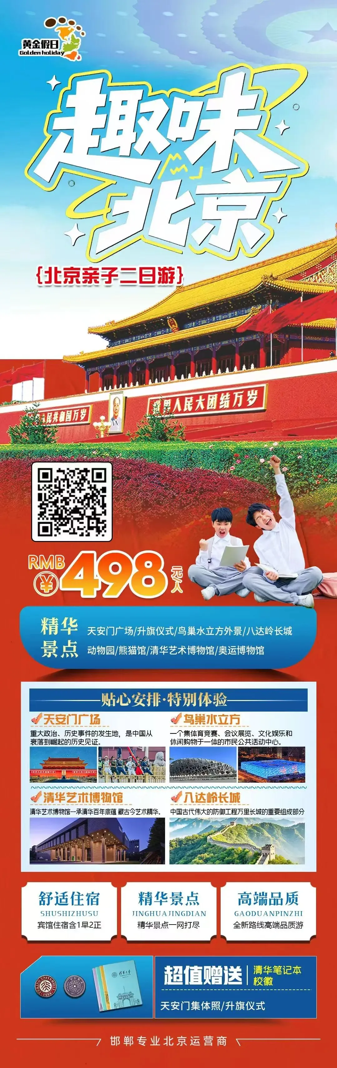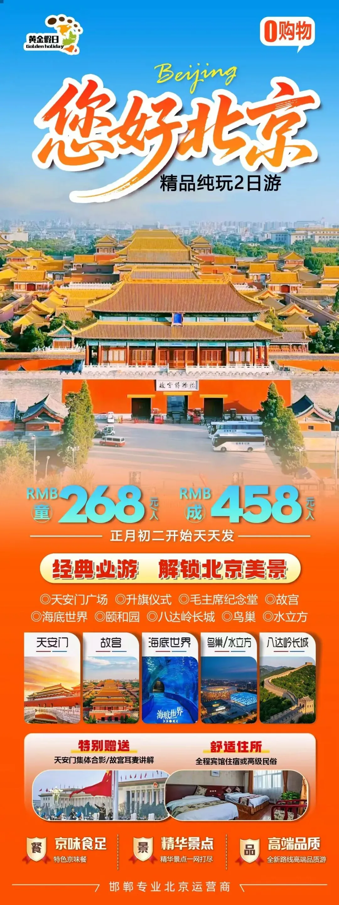 简介:天安门广场/升旗仪式/鸟巢水立方外景/八达岭长城/动物园/熊猫馆/清华艺术博物馆/奥运博物馆咨询电话:139-0330-3846,130-1210-9188行程说明:提前一天下午18:30邯郸滏阳公园西门出发,邯郸各县区都可以上车 。报价:成人498元含往返交通,保险,1晚宾馆住宿或高级民宿住宿,一早餐二正餐,景点门票。1米2以下儿童298元只含往返车费和保险,不含床位,门票免费 。必消:北京二环交通管制,进二环需换乘坐当地京牌交通和公交或地铁30元,车上交付给导游)【春节】北京纯玩升级版2日游598元