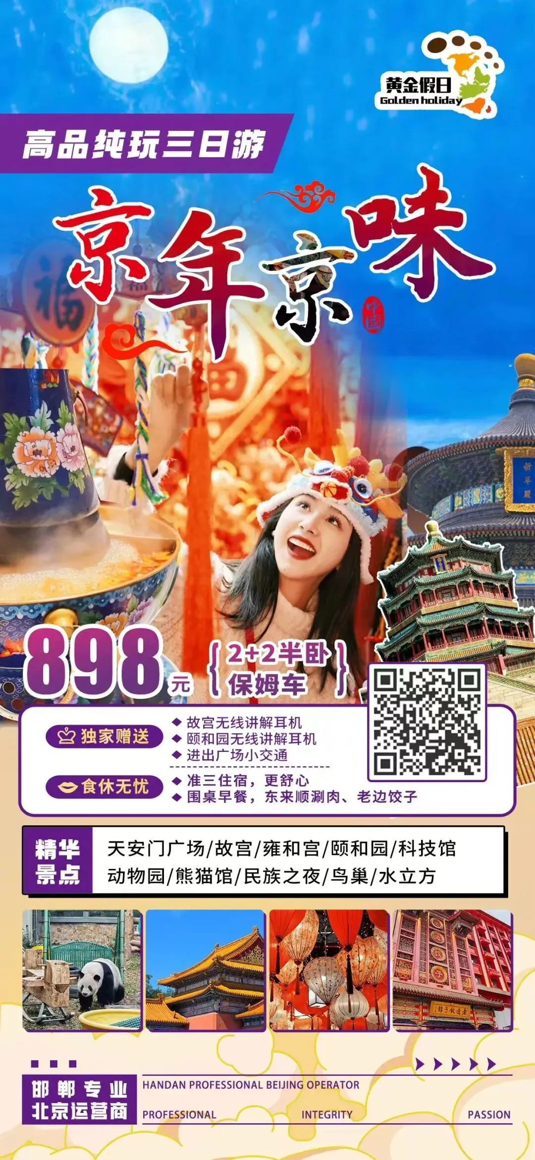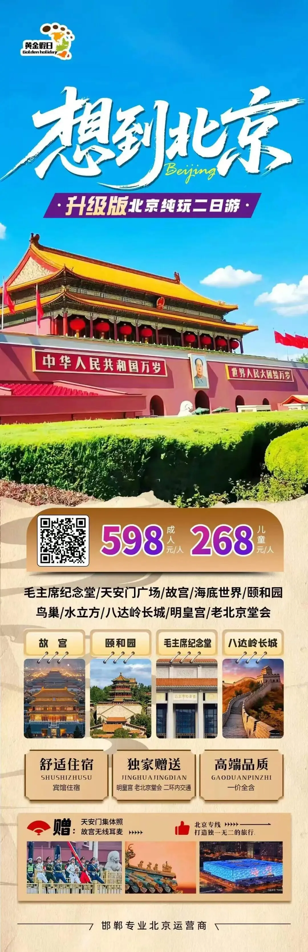 简介:天安门广场/毛主席纪念堂/故宫/什刹海/北海/老北京胡同 鸟巢/水立方/车揽清华大学/颐和园/八达岭长城 天坛套票(祈年殿+回音壁+圆丘坛)/明皇宫/老北京堂会咨询电话:139-0330-3846,130-1210-9188行程说明: 提前一天早晨5:30邯郸滏阳公园西门出发,邯郸各县区都可以上车 。报价:成人698元,包含往返交通,两晚宾馆住宿,两早(打包餐)一顿自助餐一顿饺子 ,保险,景区门票1米2以下儿童398元 不含床位,门票免费,其余和成人一样门票说明:故宫门票需提前7天预定,若报名晚了没有故宫门票,改为恭王府或退门票钱。毛主席纪念堂门票每天限量预约,默认只看外观,不保证约到门票。【春节】北京亲子三日游798元