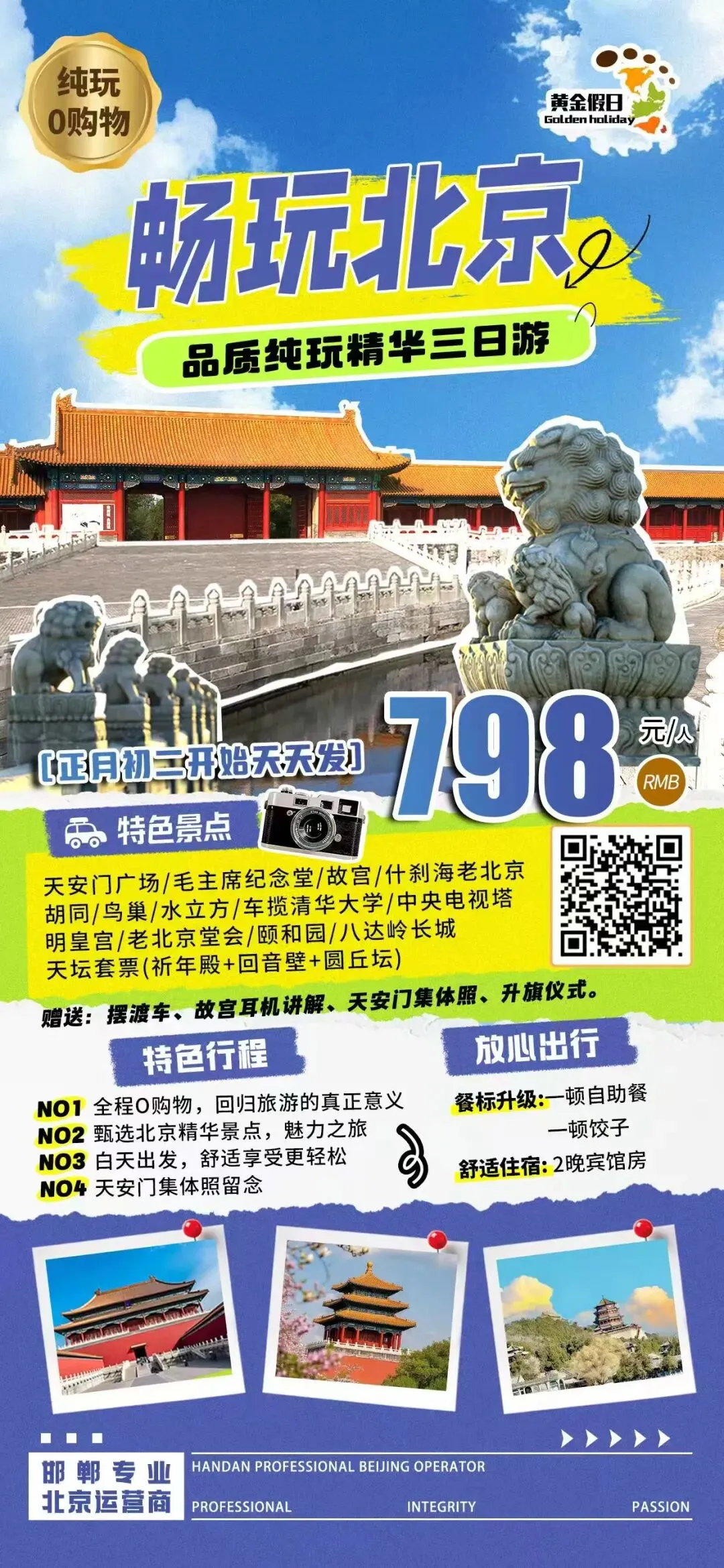 简介:毛主席纪念堂/天安门广场/故宫/✴海底世界/颐和园/鸟巢/水立方/八达岭长城/✴明皇宫/✴老北京堂会咨询电话:139-0330-3846,130-1210-9188行程说明:提前一天下午18:30邯郸滏阳公园西门出发,邯郸各县区都可以上车 。报价:成人598元含往返交通,保险,一晚农家住宿一早餐二正餐,景点门票。1米2以下儿童268元只含往返车费和保险,不含床位,门票免费 。门票说明:故宫门票需提前7天预定,若报名晚了没有故宫门票,改为恭王府或退门票钱。毛主席纪念堂门票每天限量预约,默认只看外观,不保证约到门票。【春节】品质纯玩北京三日游698元