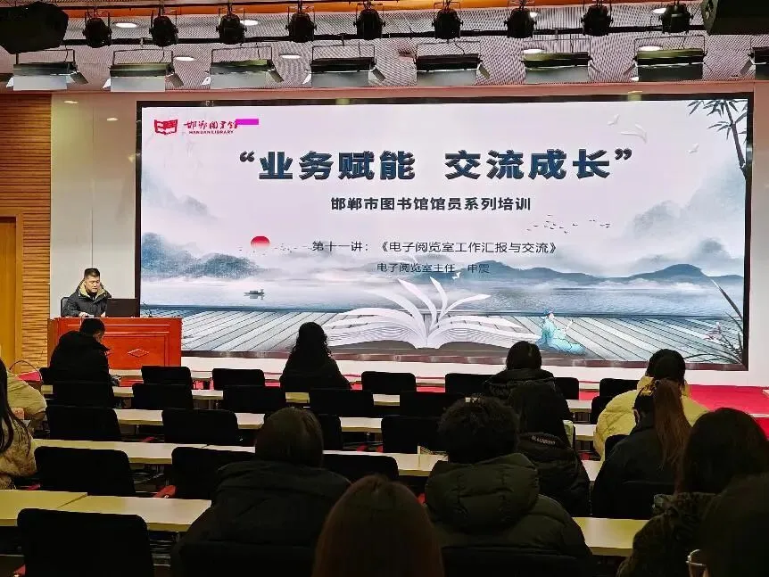 为全面提升我馆馆员的业务素质,进一步提高其工作能力和服务水平,增强我馆的学术研究氛围与研究水平,激发馆员的积极性、创造性,邯郸市图书馆于2023年5月起开展“业务赋能 交流成长”馆员系列培训活动。本系列培训分为馆长讲堂、部(室)主任讲堂、业务骨干讲堂三部分,由主讲人讲授自己在日常业务管理工作、业务技能及学术研究等方面的心得体会和经验做法。第十一场培训于2024年12月19日上午在图书馆负一楼报告厅举行。本期“部(室)主任讲堂”由电子阅览室主任申震主讲,交流内容涵盖了“电子阅览室发展历程”、“电子阅览室现状”,以及“开展的阅读推广活动”三大板块。首先,申震主任介绍了邯郸市图书馆电子阅览室自1982年搬迁至人民路98号、2009年原址拆迁后搬迁至联纺路德源大厦临时馆,再到2014年搬迁至如今新馆历史长河中的时代衍变与发展历程,并深刻阐述了互联网技术和信息技术发展对图书馆电子阅览室的冲击和挑战,这也是全国各级各类图书馆电子阅览室发展的一个缩影。其次,申震主任介绍了邯郸市图书馆电子阅览室的服务现状,以及新时代背景下电子阅览室发展中面临的一些问题,如手机的普及对电子阅览室服务读者群体与服务人数的冲击等,同时深入剖析了电子阅览室开展的个性化服务,进而使馆员们对电子阅览室的工作有了更为深刻的认知。通过本次交流学习,全体馆员对电子阅览室的工作有了更深入的了解,对提升全体馆员业务素养起到了一定的推动作用。今后我馆将持续开展馆员系列培训,以“传帮带、促交流、共成长”为目标,形成图书馆与图书馆员共同成长、共同发展的良好环境,以期进一步满足广大读者的阅读需求,持续为其提供高质量的公共文化服务!