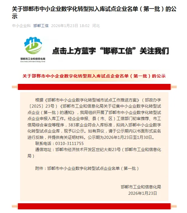 近日,邯郸市工业和信息化局发布《关于邯郸市中小企业数字化转型拟入库试点企业名单(第一批)的公示》,五得利面粉邯郸公司成功入选。
