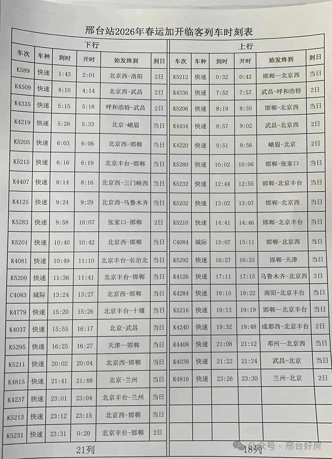 铁路部门提醒广大旅客,春运期间列车开行可能根据客流情况动态调整,旅客可关注火车站公告或铁路12306网站(含手机客户端)查询,合理安排行程。附件:春运期间计划加开途经邢台火车站的临客列车时刻表