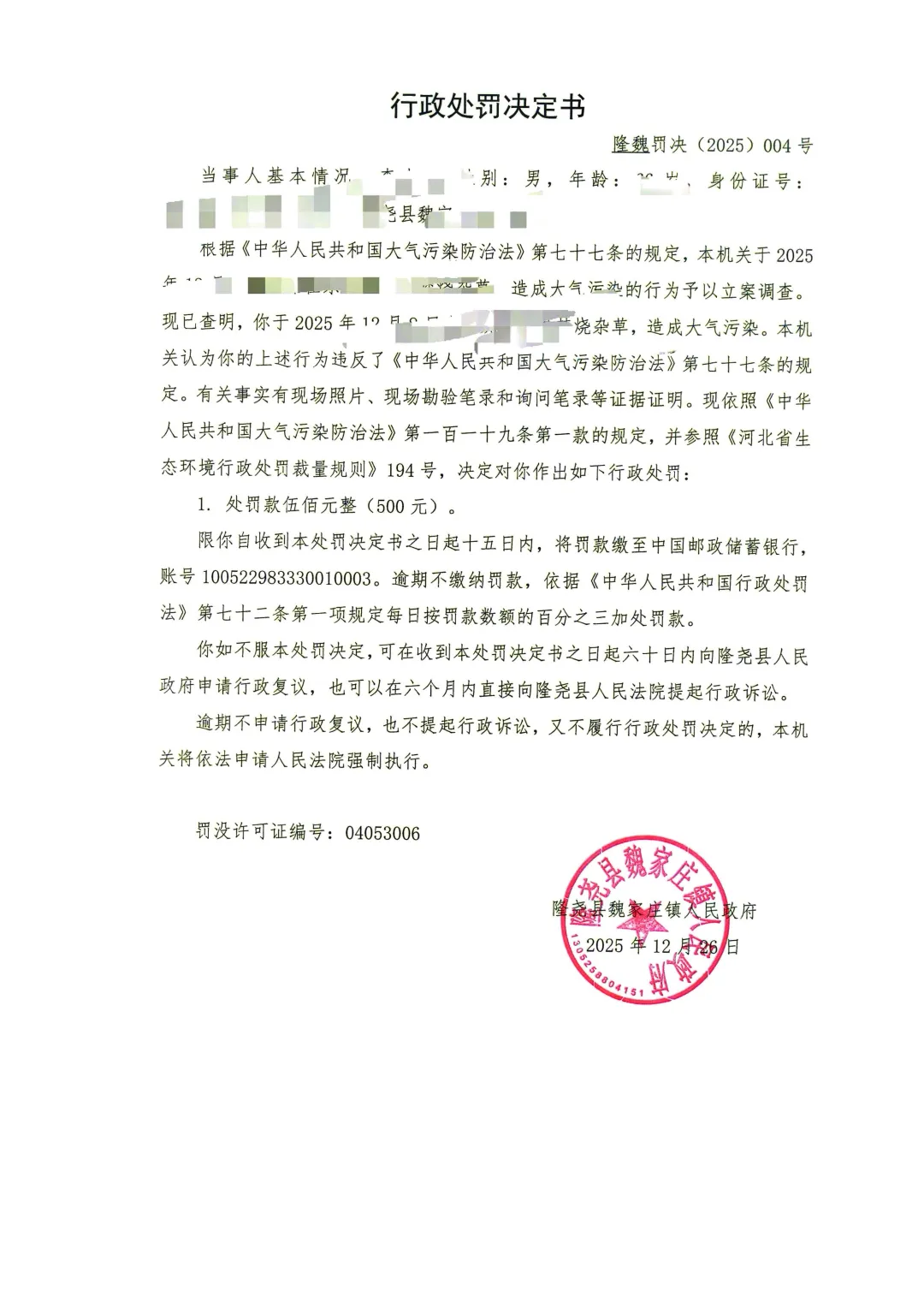 近日,邢台隆尧县一村民引燃路旁杂草,触发天眼预警后被执法人员处置,按规定罚款 500 元。