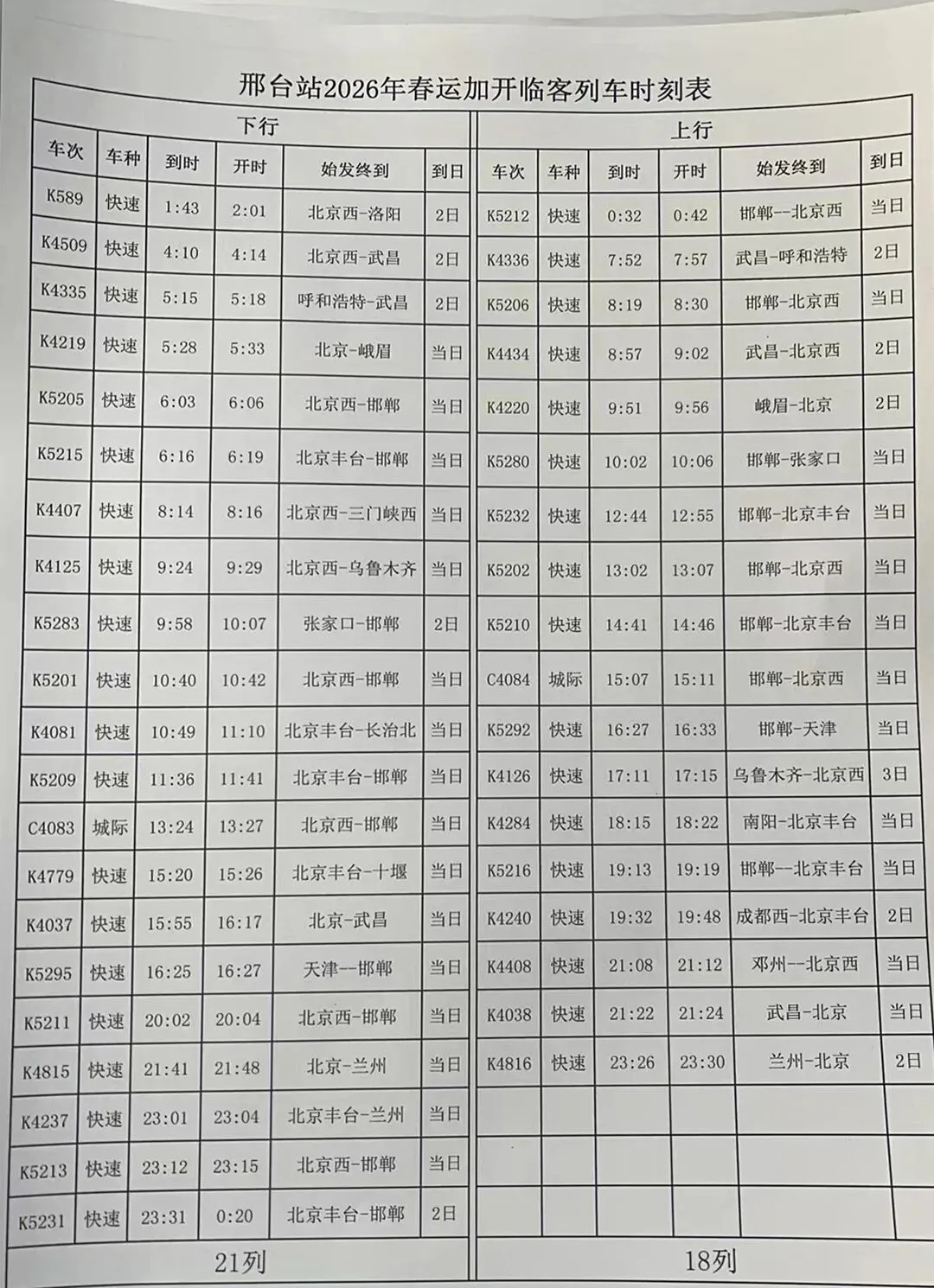 途经邢台火车站加开临客,南行21列,北行18列。“此次加开的临客,既方便了邢台旅客前往洛阳、武昌、兰州、乌鲁木齐等城市的跨省长途出行,也进一步加密了前往北京、天津、石家庄、邯郸等周边城市的短途线路,能够更好地满足旅客在春运期间的多样化出行需求。”邢台火车站相关负责人介绍,目前车站已全面完成春运准备工作。车站提前启动了“春运设备保障专项行动”,对安检、闸机等服务设施进行了全面检修和升级。候车室内已设立“春运服务岗”,配备轮椅、急救包等,为重点旅客提供贴心服务。春运期间,还将在客流高峰日增派服务人员,加强现场引导,全力营造“平安、有序、温馨”的出行环境。
