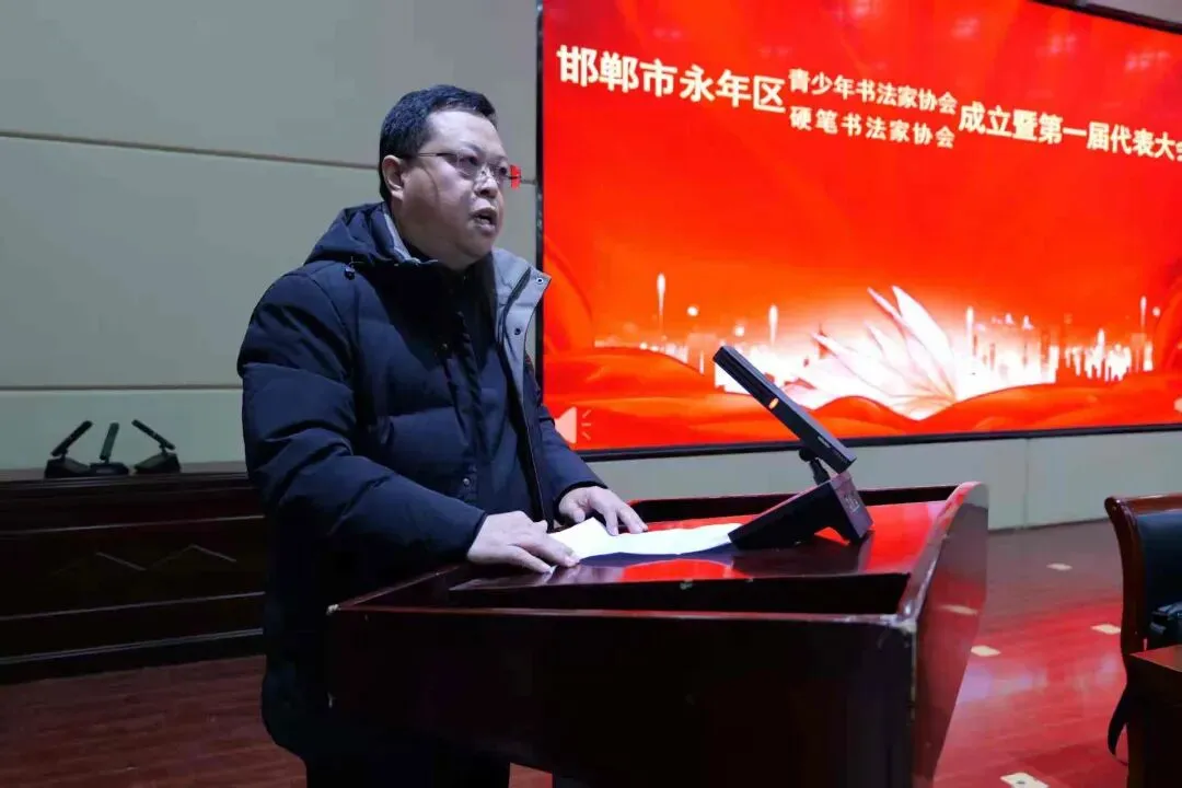 河北省硬笔书法家协会副主席、邯郸市硬笔书法家协会主席王旭东、邯郸市青少年书协副主席、邯郸韩玉臣美术馆执行馆长何家骢、区文联主席常炳革分别讲话,向邯郸市永年区第一届青少年书法家协会、硬笔书法家协会的成立表示祝贺,对他们未来的工作发展寄予了亲切希望并提出要求。