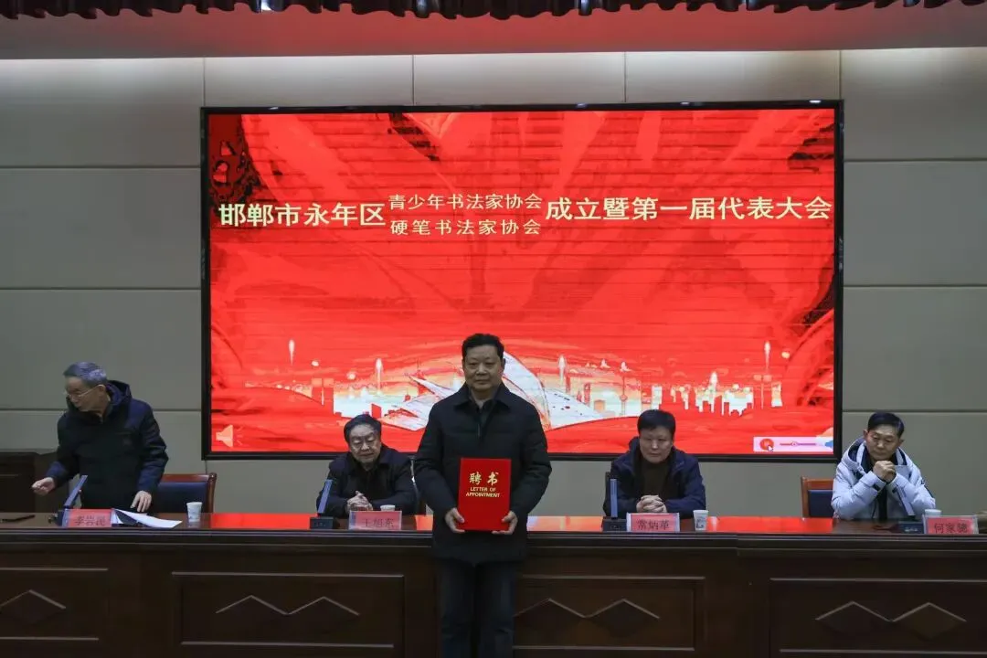 邯郸市永年区硬笔书法家协会第一届理事会聘请何书斌为名誉主席。聘请王宇、安振营、胡社章为顾问,并向名誉主席和顾问颁发了证书。