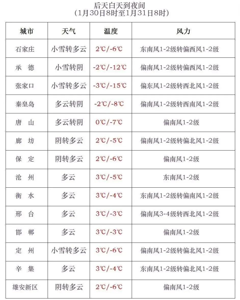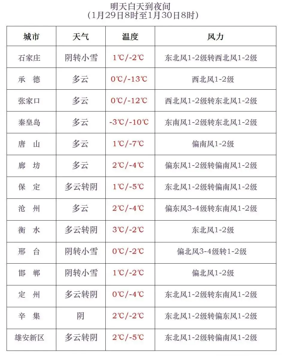 明天夜间到30日,全省多云转阴,张家口、承德、唐山、秦皇岛北部、保定、石家庄、邢台西部、邯郸有小雪或零星小雪,局地有中雪,西部山区个别地点有大雪。