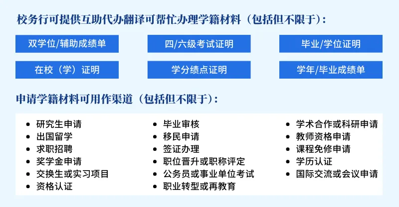 现可通过『校务行|互助代办翻译』申请办理,省时省力无需回校轻松实现“成绩单证明文件送到家”!