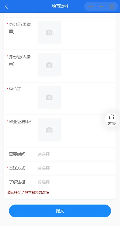 2. 填写个人信息并上传身份证复印件、毕业证或学位证复印件等相关资料后,点击提交;后台将会在收到申请后进行审核,审核通过后即可为您提供代办服务。