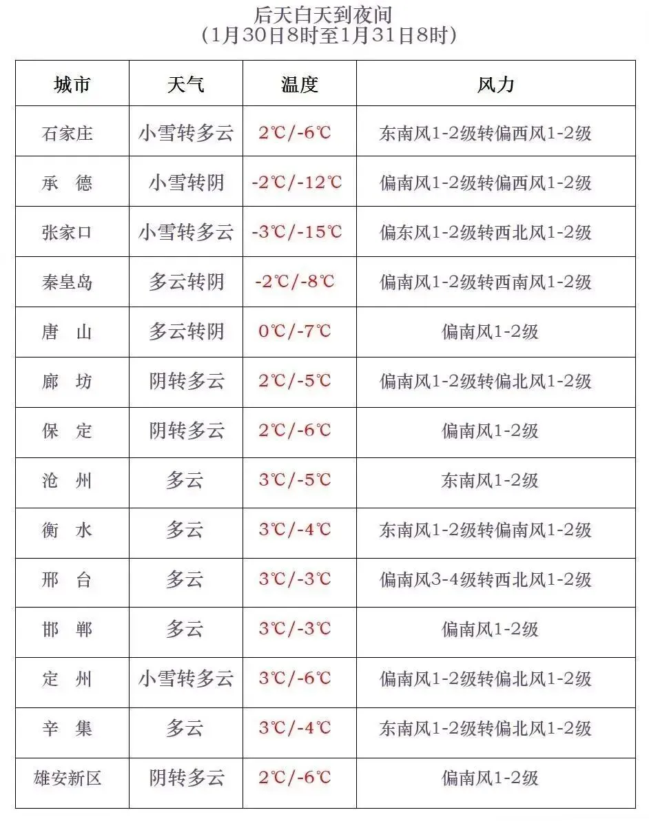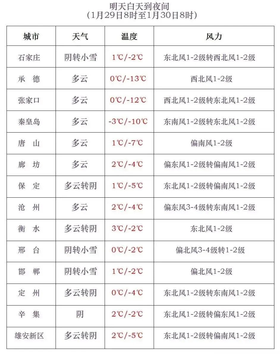 明天夜间到30日,全省多云转阴,张家口、承德、唐山、秦皇岛北部、保定、石家庄、邢台西部、邯郸有小雪或零星小雪,局地有中雪,西部山区个别地点有大雪。