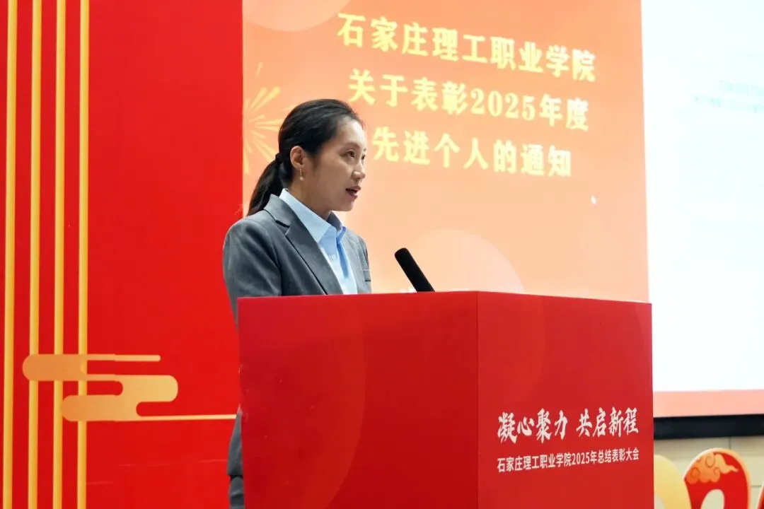 党委委员、副校长白尉华宣读《石家庄理工职业学院关于表彰2025年度先进个人的通知》《石家庄理工职业学院关于表彰2025年度就业工作先进集体及先进个人的通知》《石家庄理工职业学院关于表彰2025年度征兵工作先进集体及先进个人的通知》。