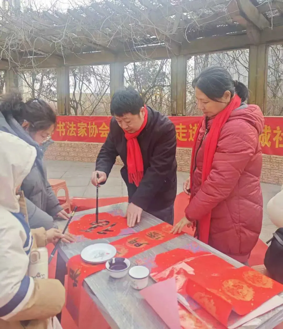 中书协理事、邯郸市文联副主席、市书协主席李琦,市书协副主席关建洲、赵继成、王付利,副主席兼秘书长郜峰,副主席韩建军、杜春林、贾红敏、王建勋,市文艺评论家协会副主席郭连莹,经开区东方新城社区党支部书记汲建勋,世纪集团中昱物业总经理贾亚亮,东方新城物业经理高豪,市书协副秘书长、经开区书协主席汲战陆,市书协副秘书长张玉广,理事孟丽萍、胡晓华、靳增刚、王丽、杨智斌、王鹏伟以及经开区书协骨干等30余人参与了写春联、送祝福活动。