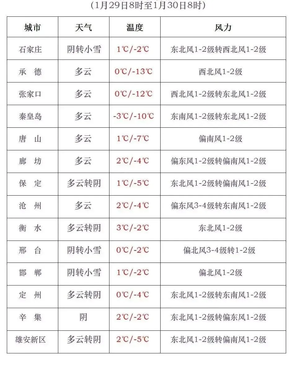 今天夜间到30日,全省多云转阴,张家口、承德、唐山、秦皇岛北部、保定、石家庄、邢台西部、邯郸有小雪或零星小雪,局地有中雪,西部山区个别地点有大雪。