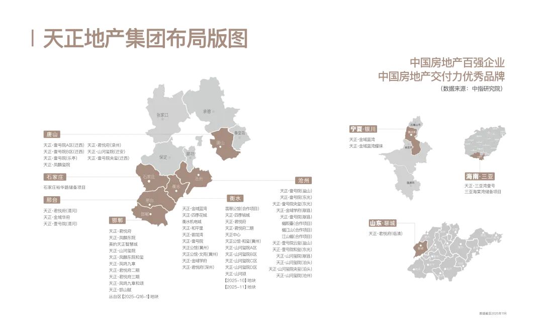 首先纠正一个概念错误,天正可不是什么偏安一隅的衡水地方房企,无论规模、产品还是市场口碑,它都是名副其实的河北民营房企佼佼者。这家有着23年历史的实力房企,立足河北,辐射全国,发展步调早已拓展至邯郸、沧州、石家庄、三亚等地,实现9城64盘的规模布局。中指院2025河北省房企销售排行榜,仅统计其在河北省内项目,不包括三亚等异地热销项目,天正就以71.53万平方米的销售面积位列第二,仅次于石家庄城发投集团。天正地产也是难得能够跻身全国地产舞台的河北民企。2024、2025连续两年荣膺中指院中国百强房企称号,并获2025中国房地产交付力优秀品牌、2025中国物业服务百强企业等殊荣。在近期由专业机构组织的全国性论坛上,天正地产作为中小房企高质量发展、逆势崛起的样板,分享了经验。天正一向稳健经营,从不盲目追求规模扩张与土地储备,而是强调“精准投资、审慎拿地、拿地必深耕”。 在其品牌生态白皮书中,天正将其发展战略归结为“五力战略“——至诚品牌力,精细运营力,精益产品力,品质交付力,精细服务力。既重视产品和交付品质,又重视项目全周期精益化管理、运营和服务,堪称房企的“五好学生”标准,从中足见这家本土房企的视野和格局。随着楼市高周转时代的落幕,购房者关注点回归产品本身。一批专注于价值深耕的地方房企因此脱颖而出,成为全国房企争相学习的标杆。典型像河南金沙、冶都,山东新东升,南京金基等,他们无一例外,都是在自己的“主战场”合理布局、精耕细作,以严谨、真诚的姿态,充分挖掘客户需求,打造更接地气的产品。放眼河北楼市,从起点到发展路径,从产品力到客户口碑,有望成为河北版“金沙“的,除了天正,还真找不出第二个。NO.2|贰
