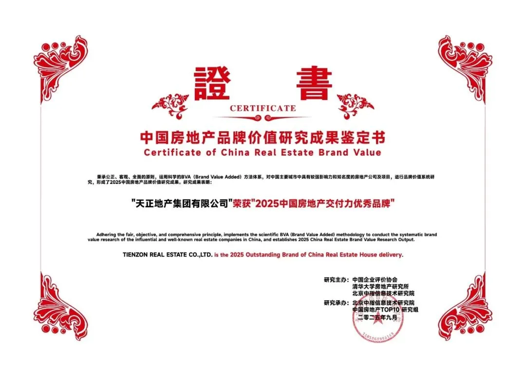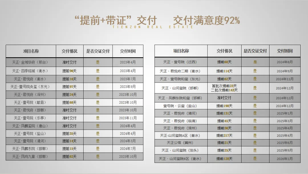 天正地产的另一突出优势,是其将交付力卷出了天花板,并已内化成为其持之以恒的品牌形象。主要体现在两个方面:其一,全部项目带证交付,大多数项目做到提前交付,有的项目甚至提前半年。其二,交付全部做到提质增配,彰显了其担当和社会责任。在延期交房、降标减配几成常态的调整期市场,如此卓越的交付力,让购房者买得安心。尤其值得一提的是,天正的提质增配并非营销动作,而是基于业主入住后的美好生活。2017年,天正御龙湾项目已全部售罄,但在董事长的坚持下,项目依然追加成本,建造占地约500平米、喷泉高度约30米的音乐喷泉。像这样产品力升级的案例还有很多,2024年是天正产品升标年,不止针对所有新项目,进行了户内交付标准、精装修大堂、园林景观、精装车库等四大升级。对已售罄未交付项目,也结合具体施工进度,进行了相应升级。比如邯郸凤麟东院项目,砸掉了原有车库统一进行全面升级,超预期交付赢得了业主广泛认可。产品升标增配成常态,这样的产品必然广受市场欢迎。截止目前,天正地产集团已累计交付30100套品质住房,交付满意度连续多年高达92%,以实绩印证兑现力即品牌力。说句题外话,提前交付、超预期交付,在市场越来越卷的当下,差不多是每个房企的梦想,但却鲜有房企能够做到。它需要有雄厚的资金实力,卓越的产品研发能力、施工管控能力,更要有打造理想人居的初心,缺一不可,因而更加弥足珍贵。这不得不说到天正地产的“勤、正、极“文化——始于勤勉,行于正道,臻于至善。它不是虚无缥缈的符号,而是细化成为对内的行动准则和对外的价值标准。这个朴素而强大的价值底盘,赋予其始终务实、稳健、低调前行的定力,使其从容穿越周期,厚积薄发,在市场调整期逆势崛起,就像“地产界的胖东来”。NO.4|肆