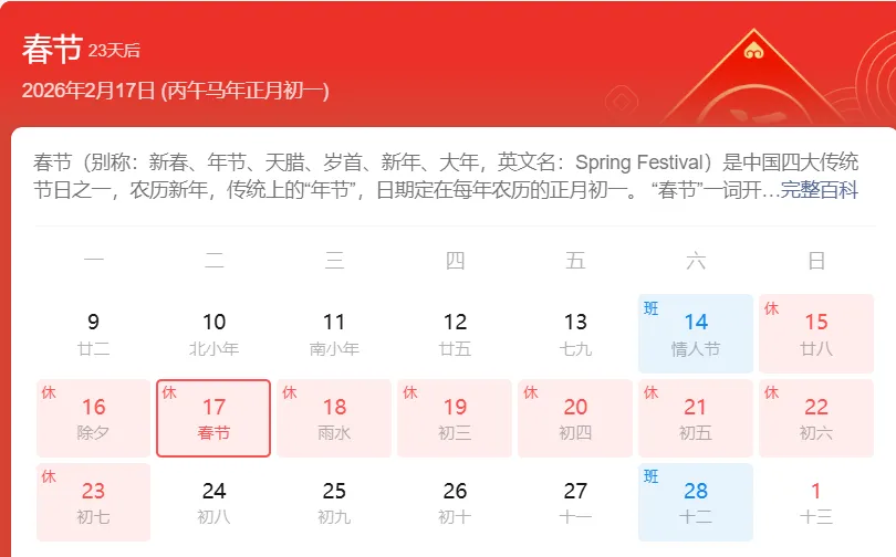 2月15日(农历腊月二十八、周日)