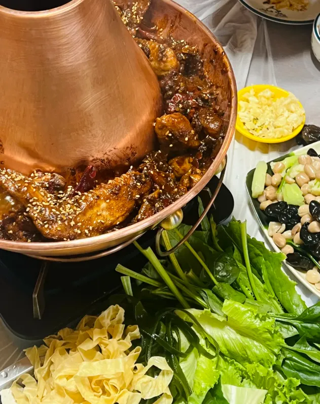 这火锅鸡,选用的是带骨的鸡肉,不过油,直接炖。做法粗犷,重点在那个蘸料——蒜泥加醋。刚出锅的鸡肉滚烫,在蒜醋汁里一激,热气散去一半,酸辣味钻进肉缝里。咬一口,肉不柴,皮带劲,酸香解了油腻,吃得就是个满头大汗的痛快。