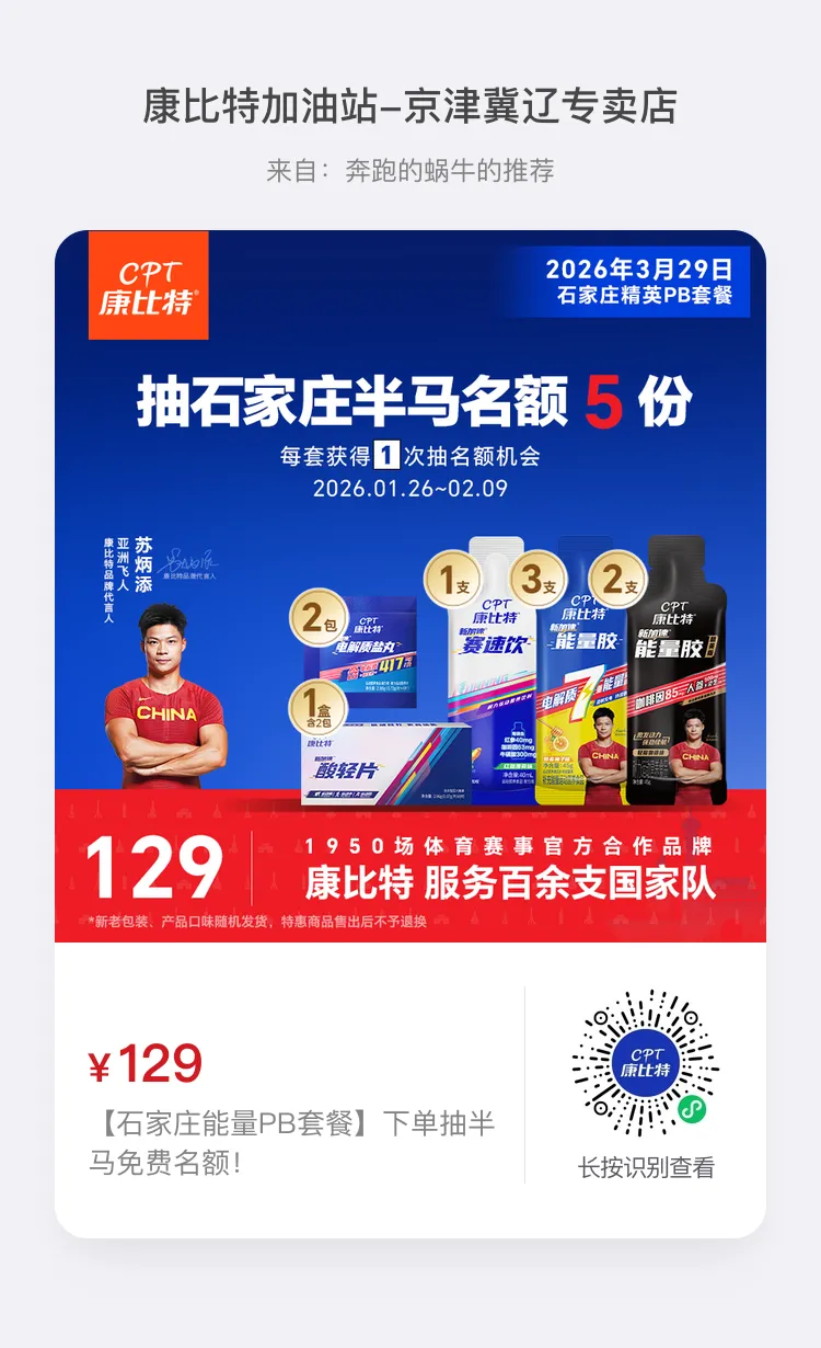 【下单抽名额】活动明细如下,具体见详情页🎁下单享双重专属权益1️⃣下单抽赛事免费名额!【石家庄能量PB套餐】下单抽半马免费名额共计5份!129元/套,每套获得1次抽名额机会,每人最高5次机会。【石家庄精英PB套餐】下单抽全马免费名额共计5份!159元/套,每套获得1次抽名额机会,每人最高5次机会。2️⃣现场领好礼: 凭活动订单截图至石家庄马拉松赛马博会康比特展位,即可免费领取康比特盐丸*1份。河北石家庄,作为河北省省会,是京津冀地区重要的中心城市之一,素有“南北通衢、燕晋咽喉”之称,从石家庄从出发,高铁1小时可达北京、郑州,1小时20分可达太原,1小时30分可达天津,1小时40分可达济南,交通十分便利。河北石家庄马拉松,创办于2009年,目前已是世界田联标牌赛事,比赛线路穿越石家庄六大城区+景点免费游+完赛前100有奖金+正宗牛肉板面免费吃,河北石家庄马拉松正吸引着越多越多跑友参赛。
