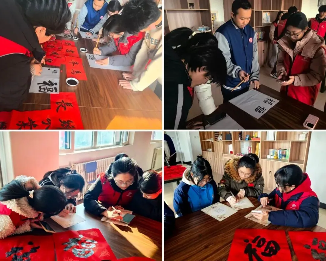活动中,团员们在书社成员的指导下,专注练习硬笔与软笔书法。红纸铺展,墨香流淌,一幅幅“福”字与春联渐次呈现。大家或俯身书写,或并肩交流,教室里洋溢着专注而温馨的气氛。活动尾声,信工学院将满载祝福的春联与“福”字赠予大家,为冬日校园增添了浓浓暖意。