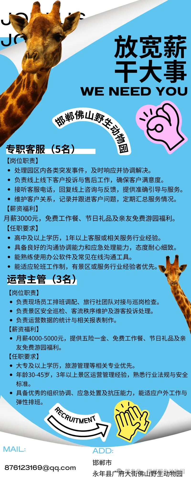 如果你已经心动,那就赶快行动!简历投递:876123169@qq.com(邮件主题请注明:应聘职位+姓名)园区地址:河北省邯郸市永年区新安村2号邯郸市佛山野生动物园