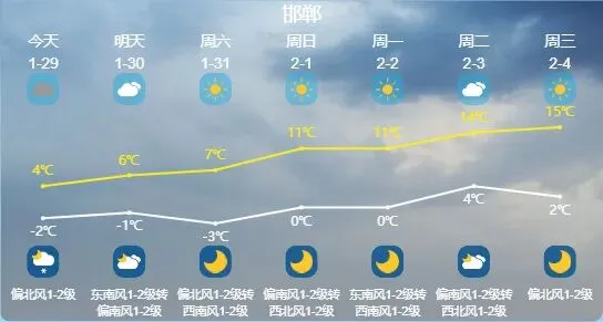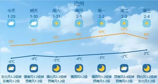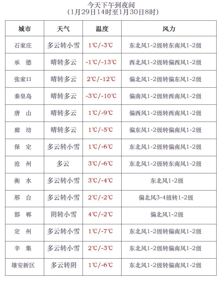 今天下午到夜间,保定、石家庄、沧州西部、衡水、邢台、邯郸多云转阴有小雪或零星小雪,局地有中雪,其他地区晴转多云。