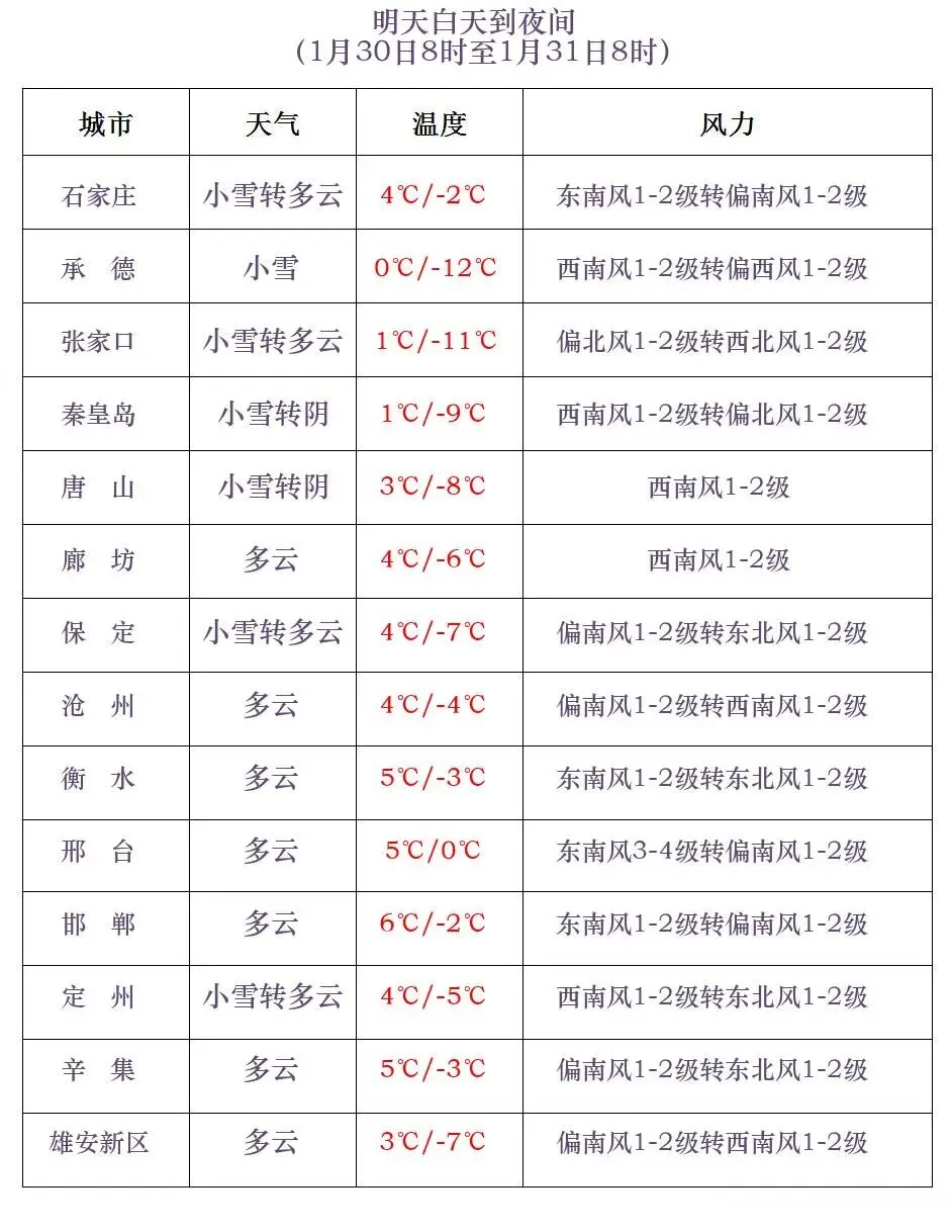 明天夜间到31日,承德东部、唐山、秦皇岛阴有零星小雪或小雪转多云,其他地区多云转晴。