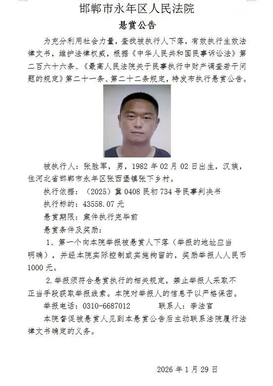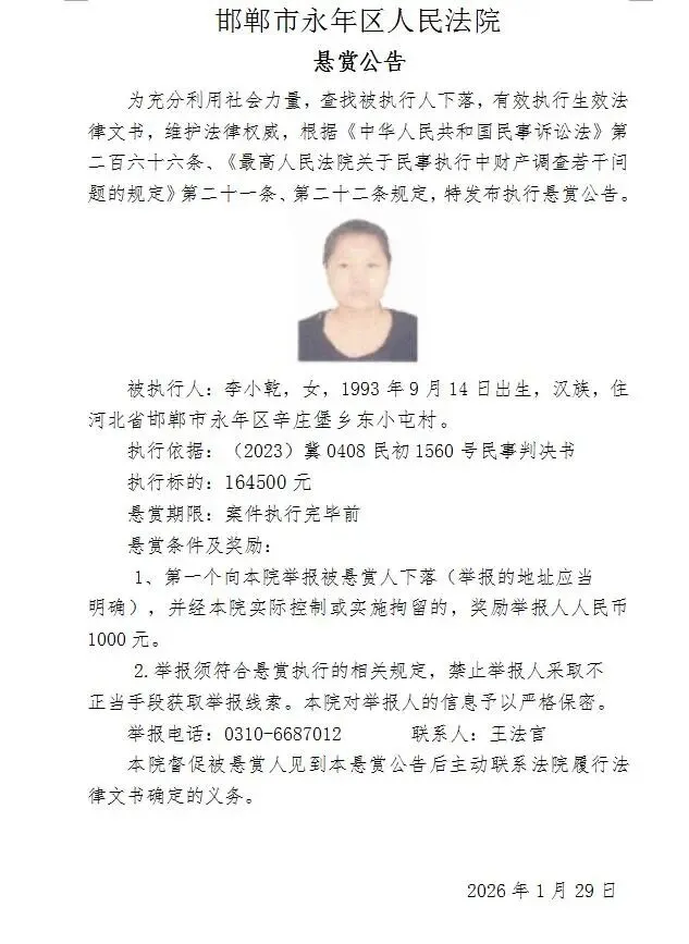 >邯郸悬赏执行:李小乾,女,1993年出生...