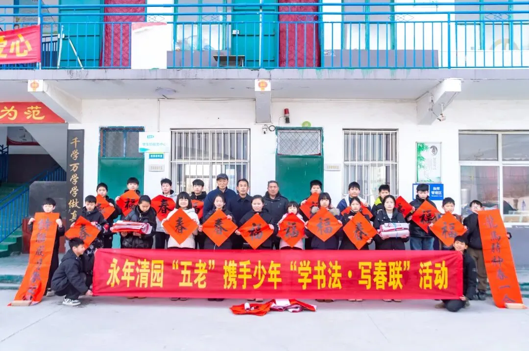 1月27日,冬日暖阳和煦,在邯郸市永年区刘营镇龙泉东小学,永年区清园“五老”韩安忠、韩增军、徐振安等在赵毓志带领下,将150副春联和200多个春字、福字赠给小学的孩子们,并向全体师生致以新年的美好祝福,鼓励他们认真学习文化知识,培养良好情操,争做社会主义优秀接班人。