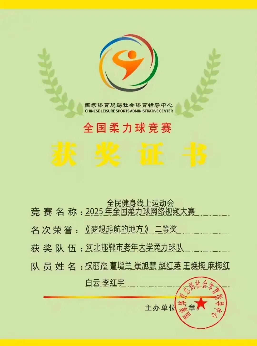 我校柔力球表演节目《梦想起航的地方》在由国家体育总局社会体育指导中心、中华全国体育总会群体部主办的“全民健身线上运动会——2025年全国柔力球网络视频大赛”中荣获二等奖。