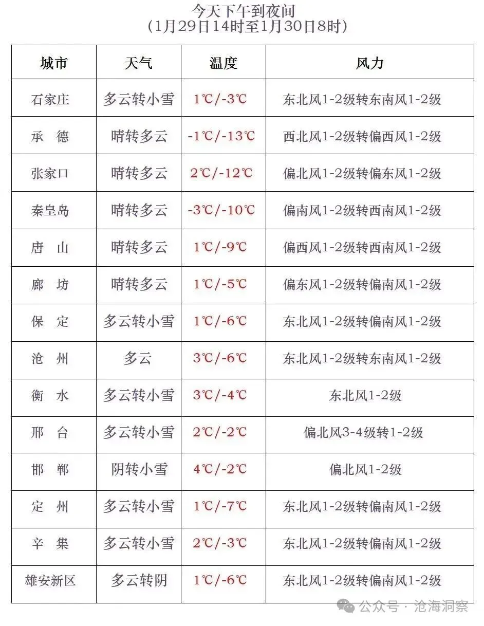 今天下午到夜间,保定、石家庄、沧州西部、衡水、邢台、邯郸多云转阴有小雪或零星小雪,局地有中雪,其他地区晴转多云。