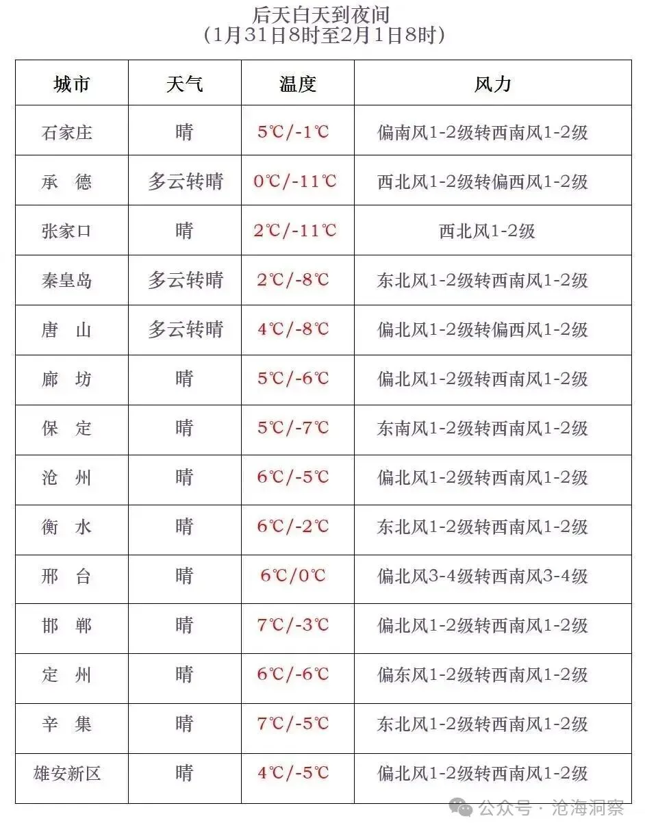 31日夜间到2月1日,坝上地区多云间晴,其他地区晴间多云。