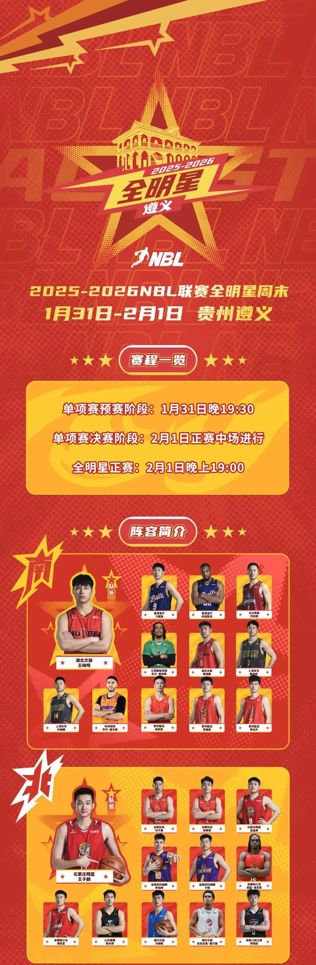 1月31日至2月1日,2025-2026NBL联赛全明星周末将在遵义奥体中心体育馆举行,入选北区代表队的王子麒、翁金郎将参加全明星赛,王子麒和翁金郎还将参加三分大赛,刘德明将参加扣篮大赛。春节之后,全队将重新集合,备战大年初五客场对阵山东蜜獾的比赛。