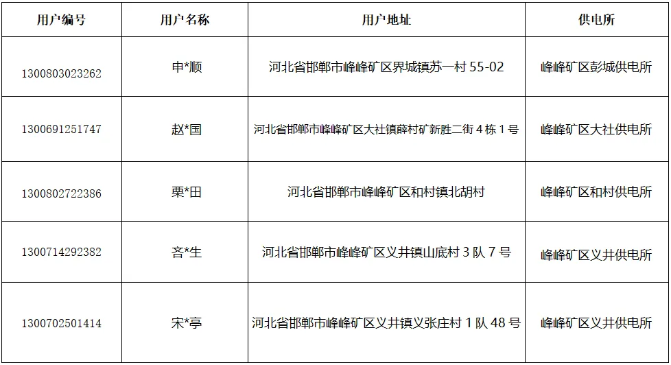 根据以上规定,区供电公司对辖区内分布式光伏发电项目进行了排查。经排查,发现有5个项目存在连续六个月以上不发电的情况,需依规进行公示。本公示自发布之日(2026年1月28日)起一个月公示期满后,区供电公司将上述情况报送峰峰矿区发展和改革局,并于2026年2月27日起陆续发起销户流程,依规予以注销。请相关投资主体留意知悉,如有异议,请于2026年2月27日前联系区供电公司进行申辩或恢复发电以证明具备发电条件。联系电话:3076597。
